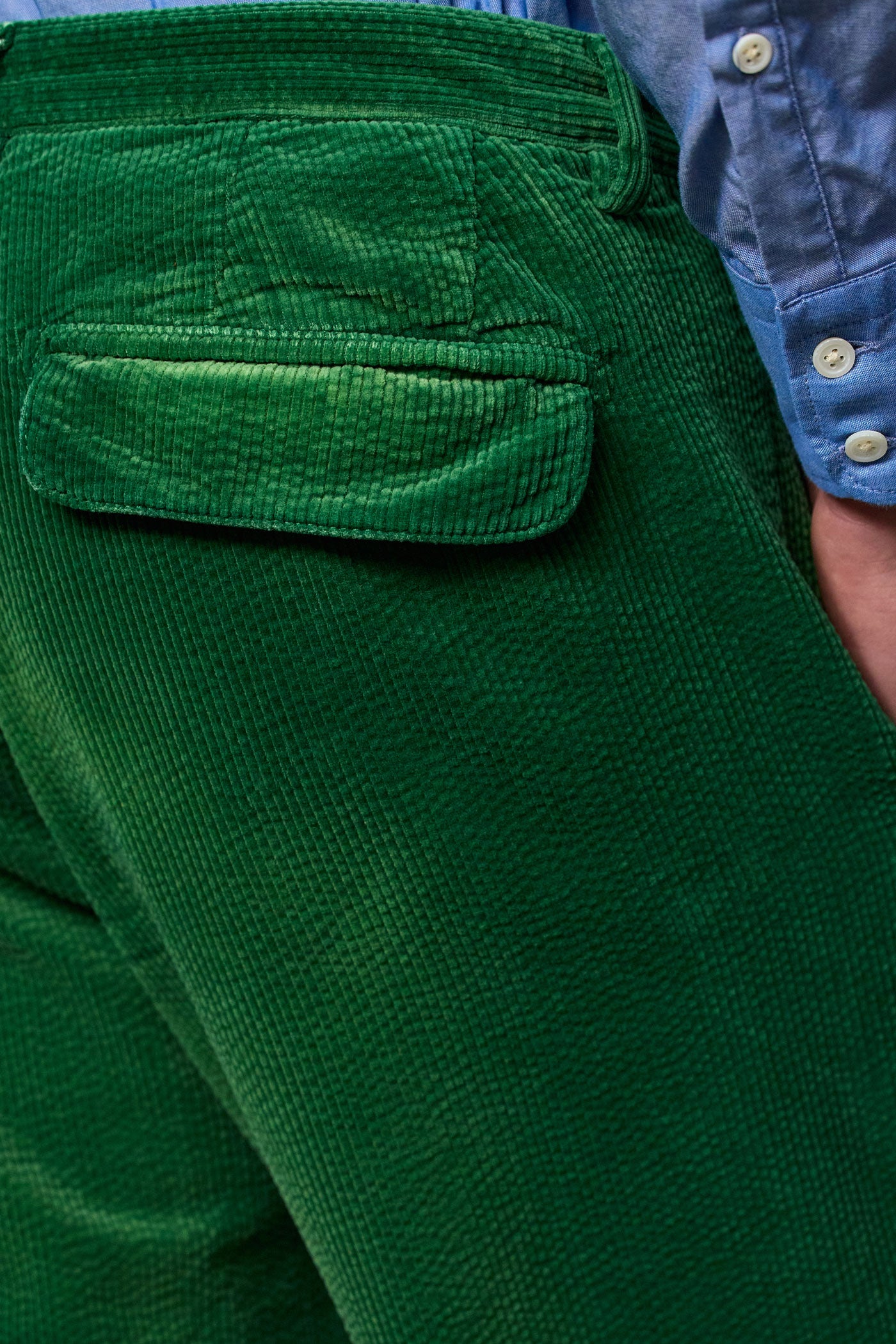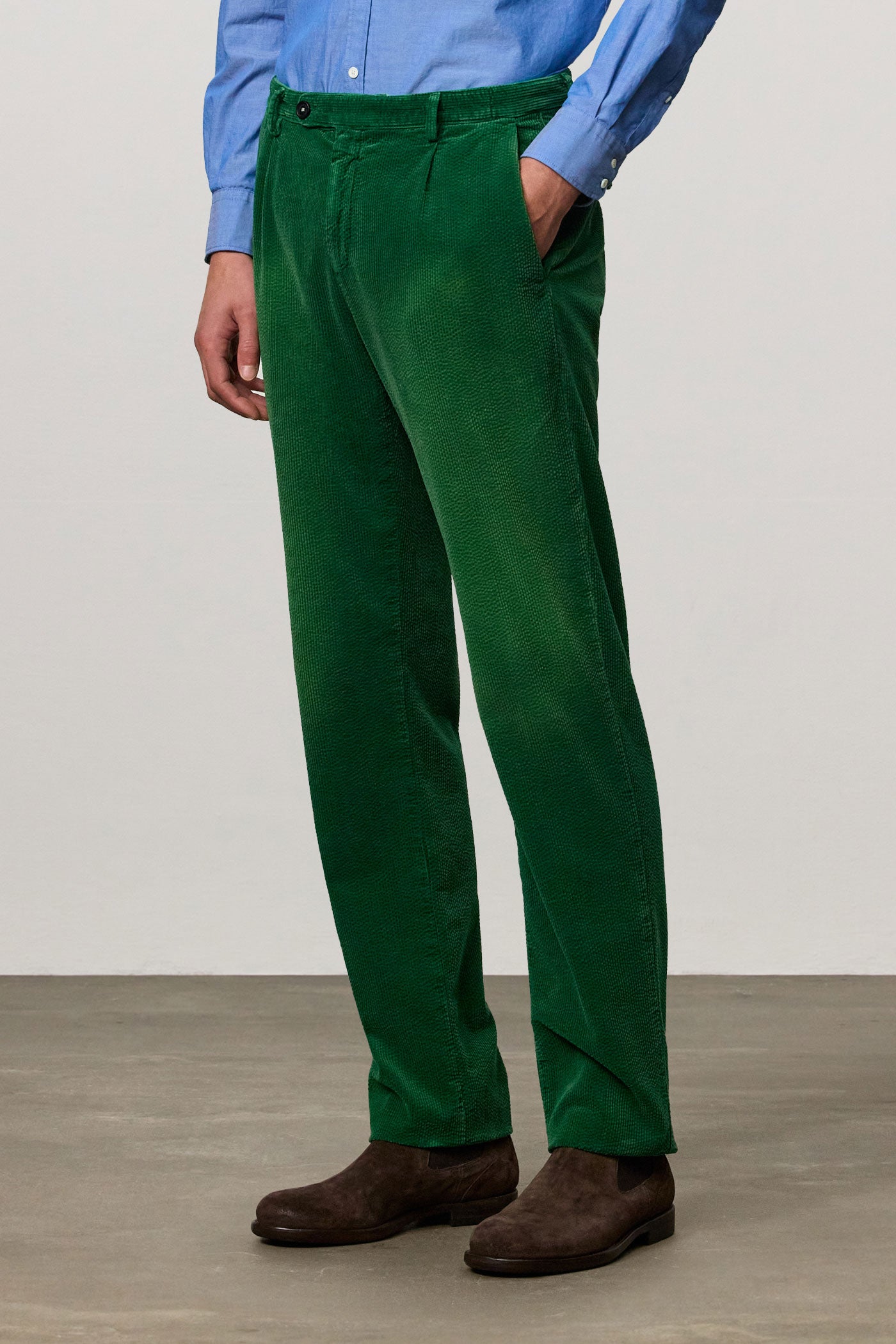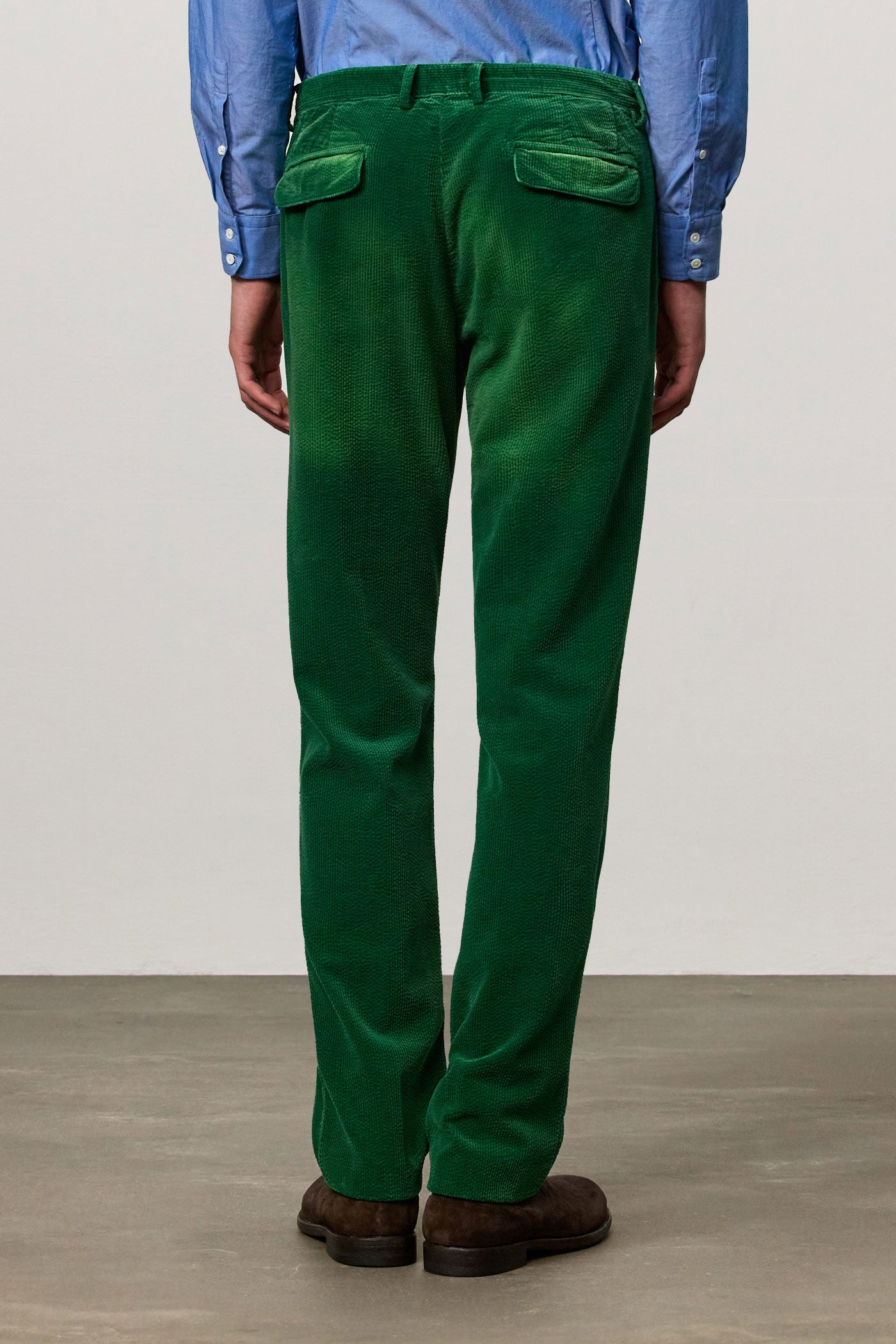 Loose fit trousers in cotton corduroy featuring stitched darts, slant pockets, a tab fastening on the front, dark horn buttons, a concealed zip, flap pockets on the back and belt loops on the waistband. Made in Italy.