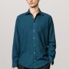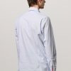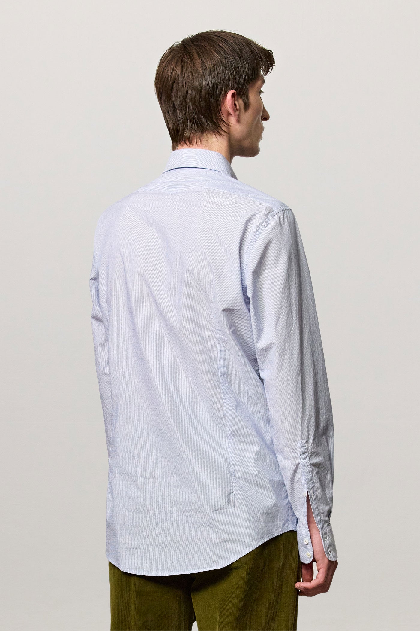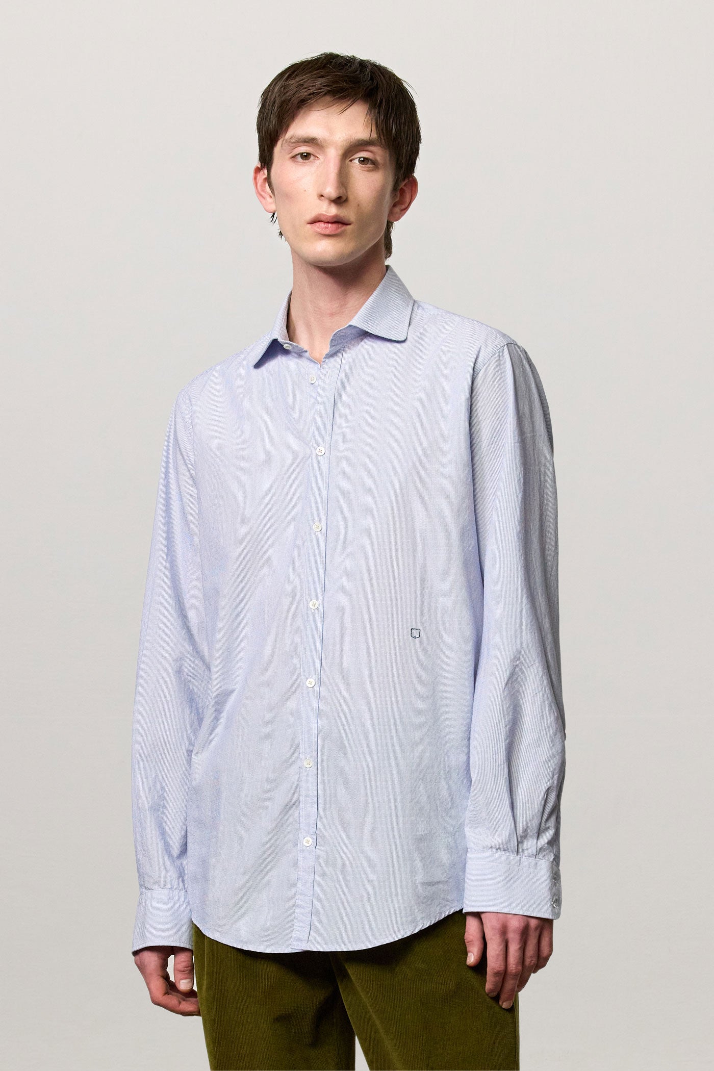 Shirt with a soft rounded collar, front closure, internal cotton voile plastron detail and embroidered crest for numbering. Pointed back yoke and rounded hem. Classic fit. Crafted from yarn-dyed cotton striped jacquard. Made in Italy.