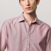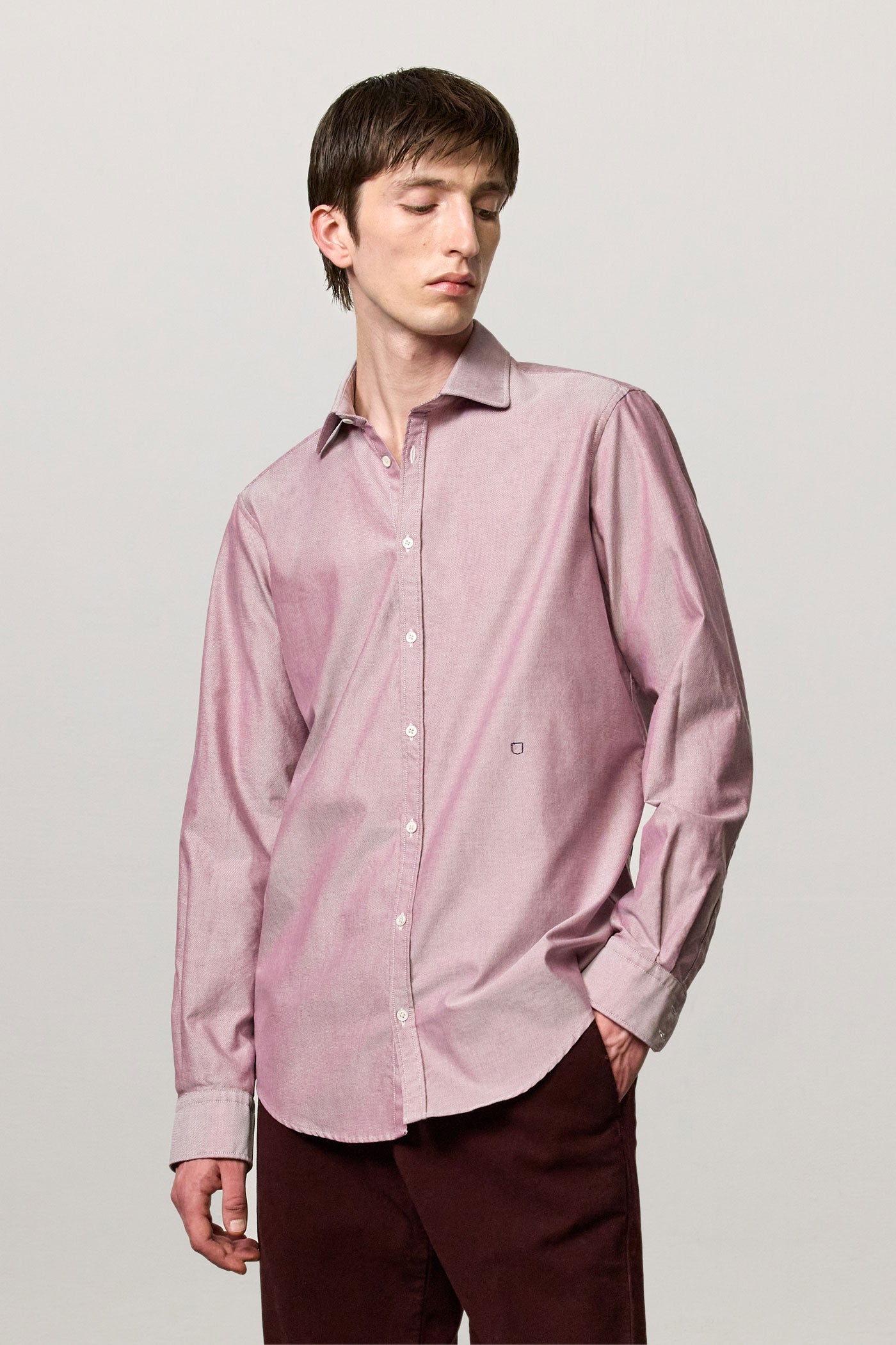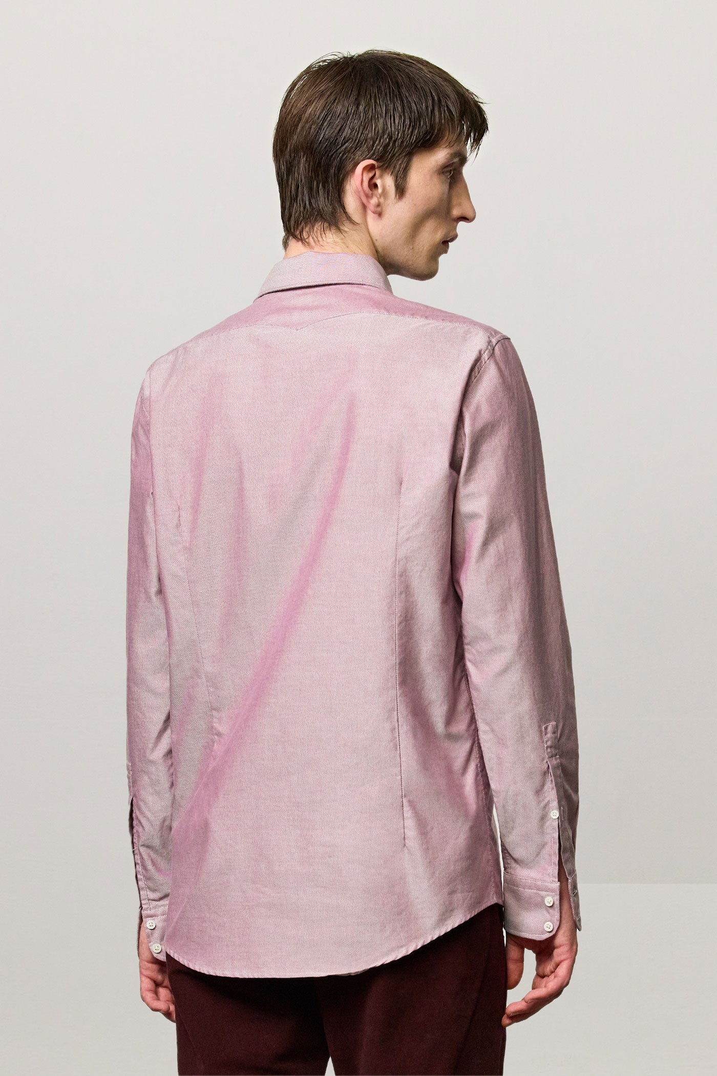 Shirt with a soft rounded collar, front closure, internal cotton voile plastron detail and embroidered crest for numbering. Pointed back yoke and rounded hem. Classic fit. Crafted from pure cotton bi-colour Oxford. Made in Italy.