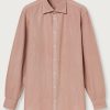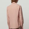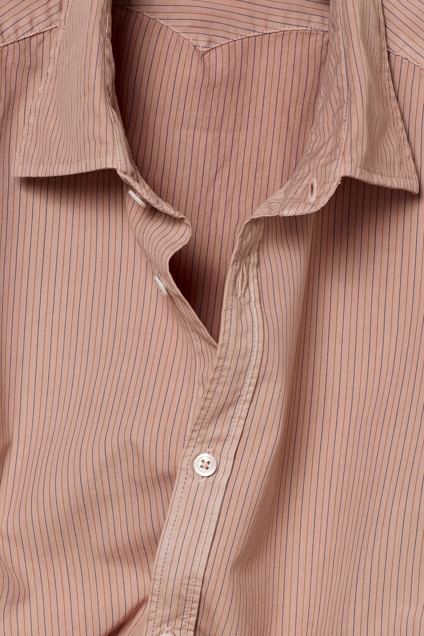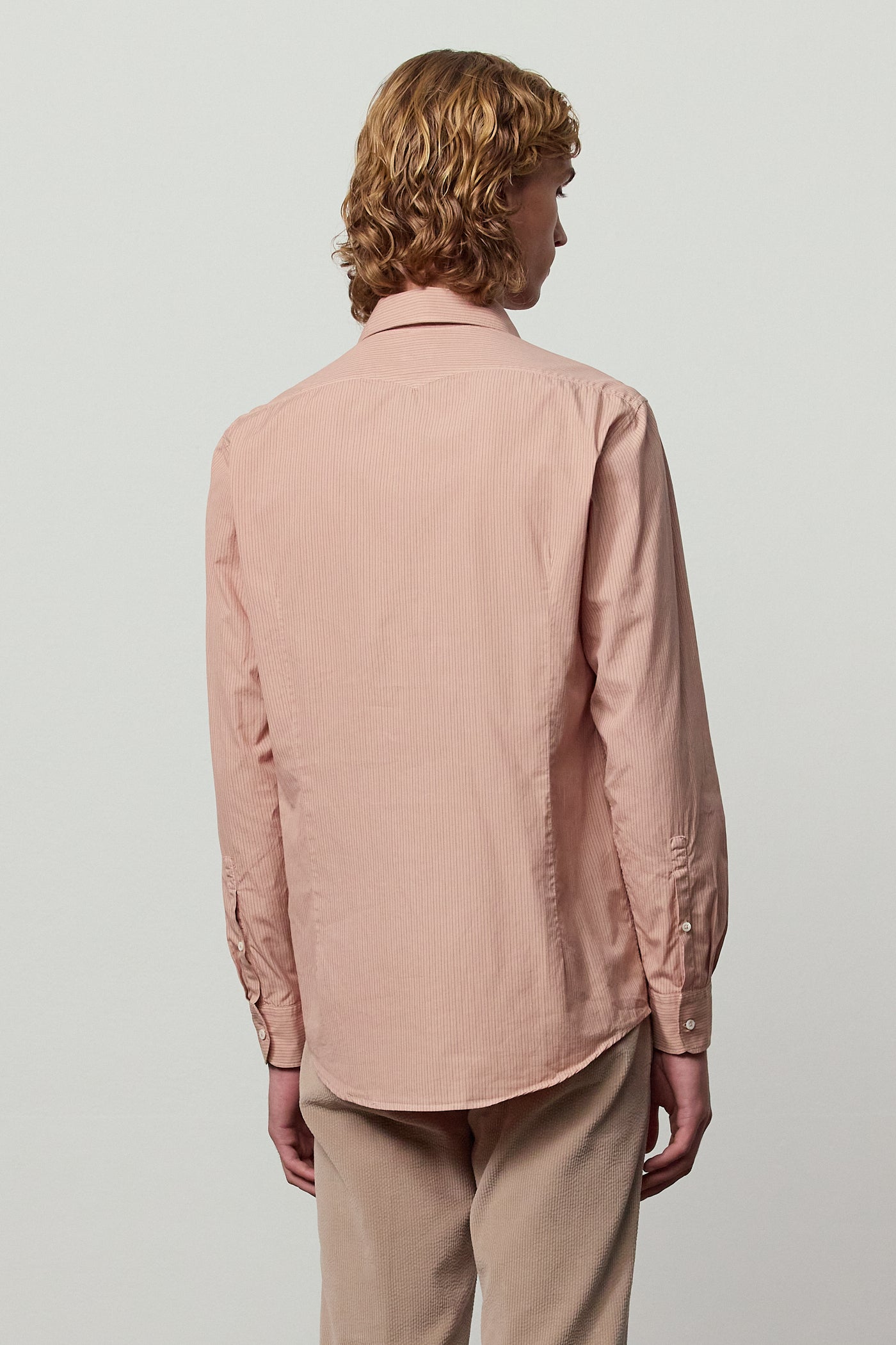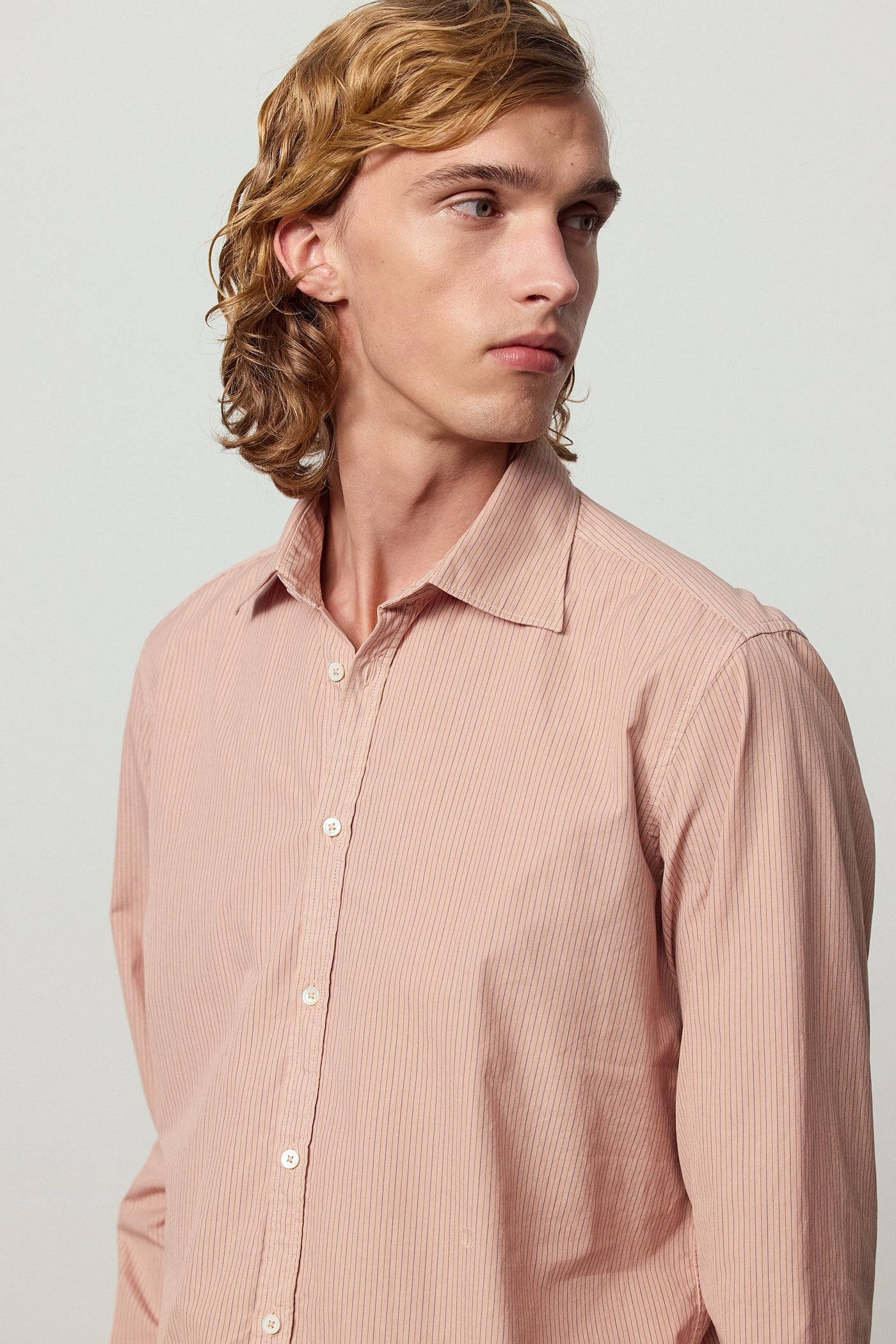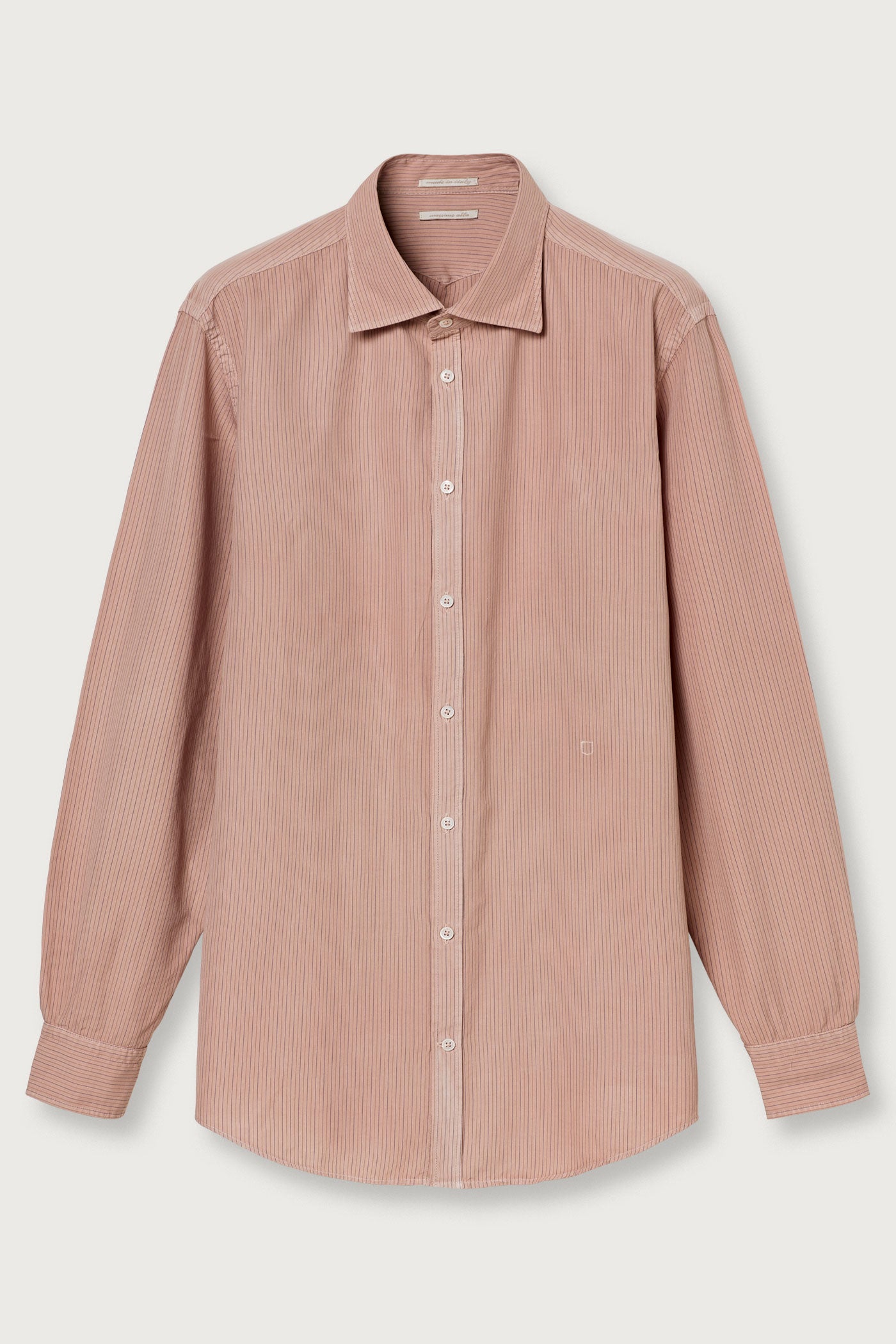 Regular-fit shirt with a pointed collar, classic soft front placket, and a cotton voilè inner bib. Made of striped watercolor cotton. Features custom badge embroidery for initials and a pointed rear yoke. Made in Italy.