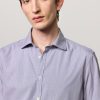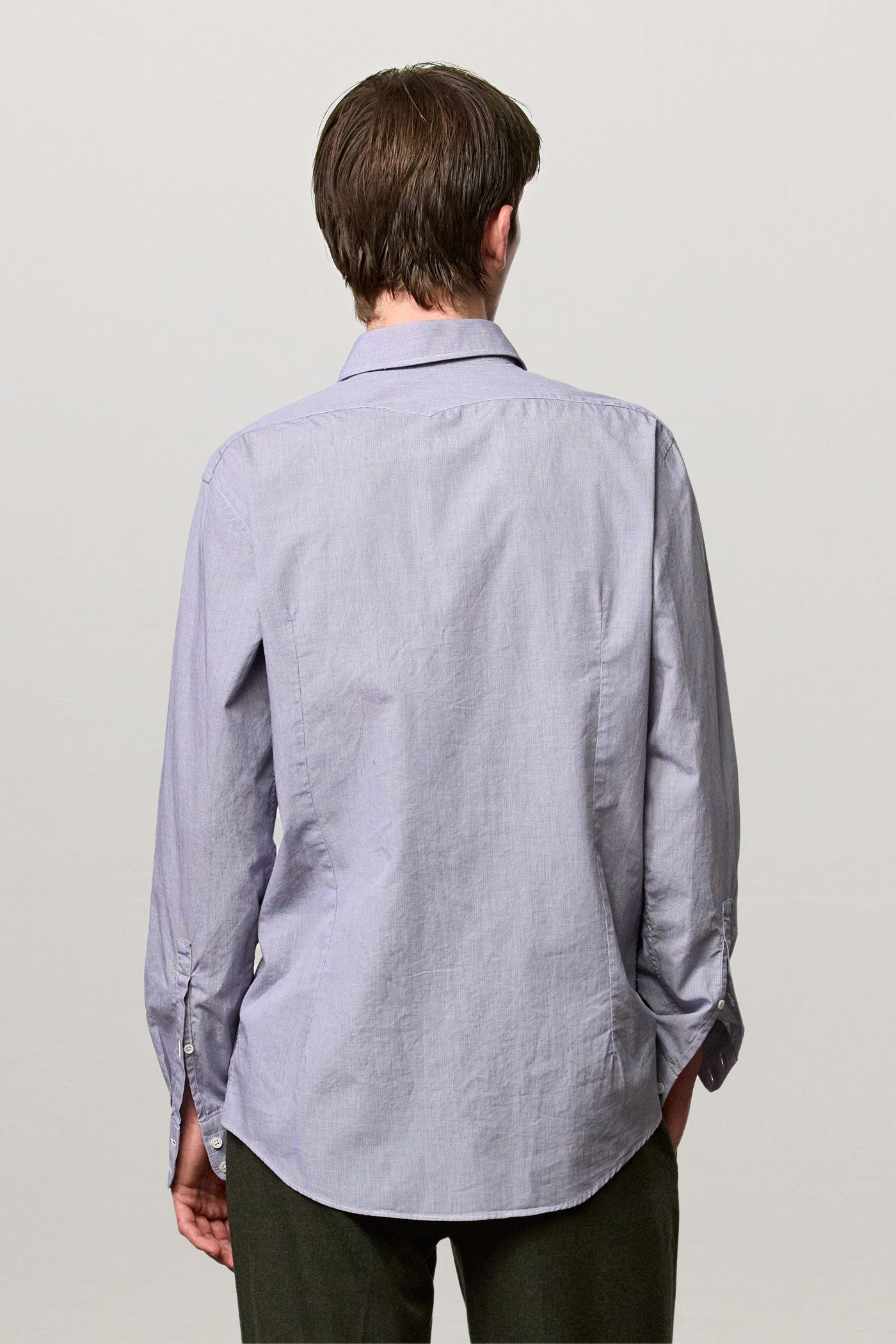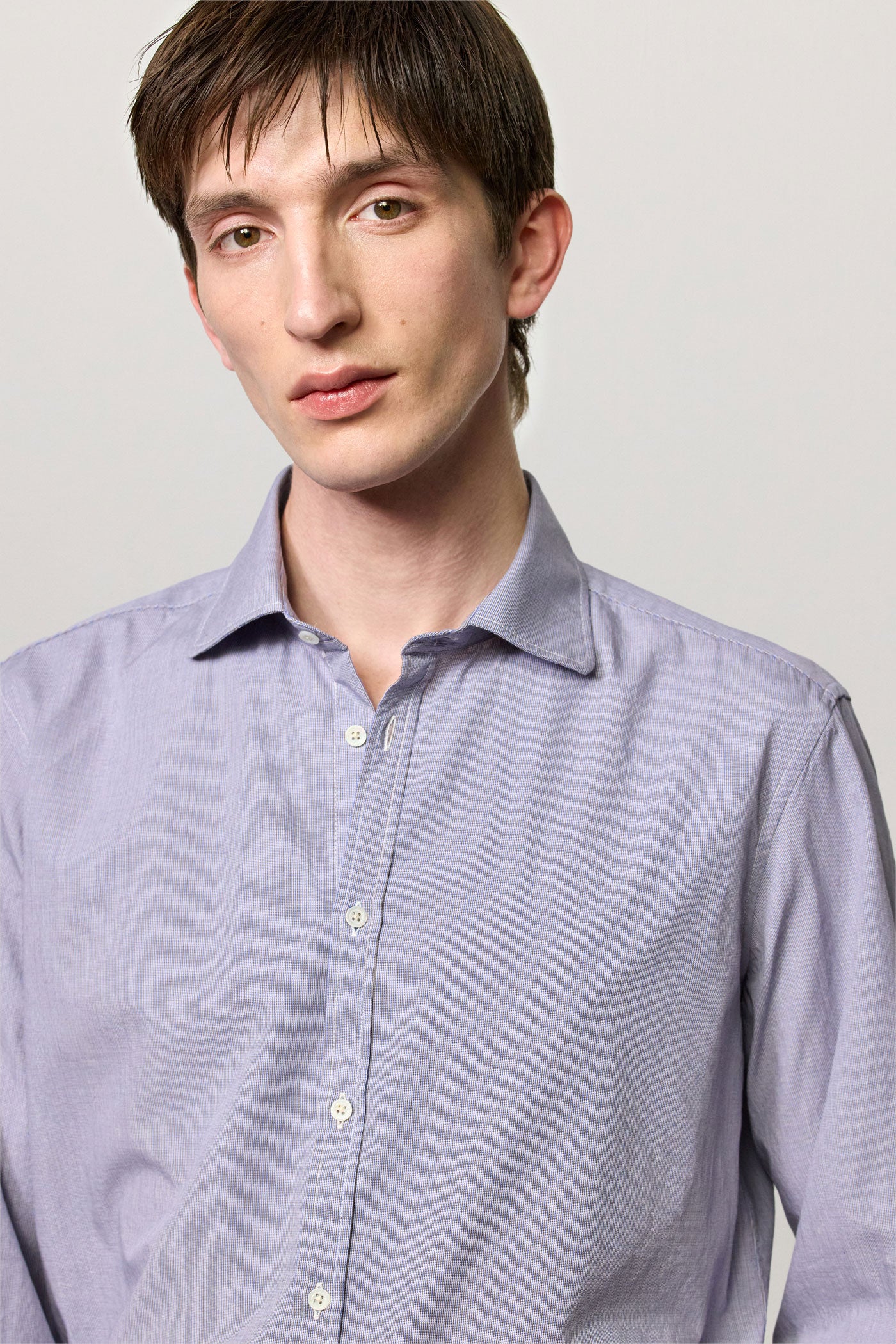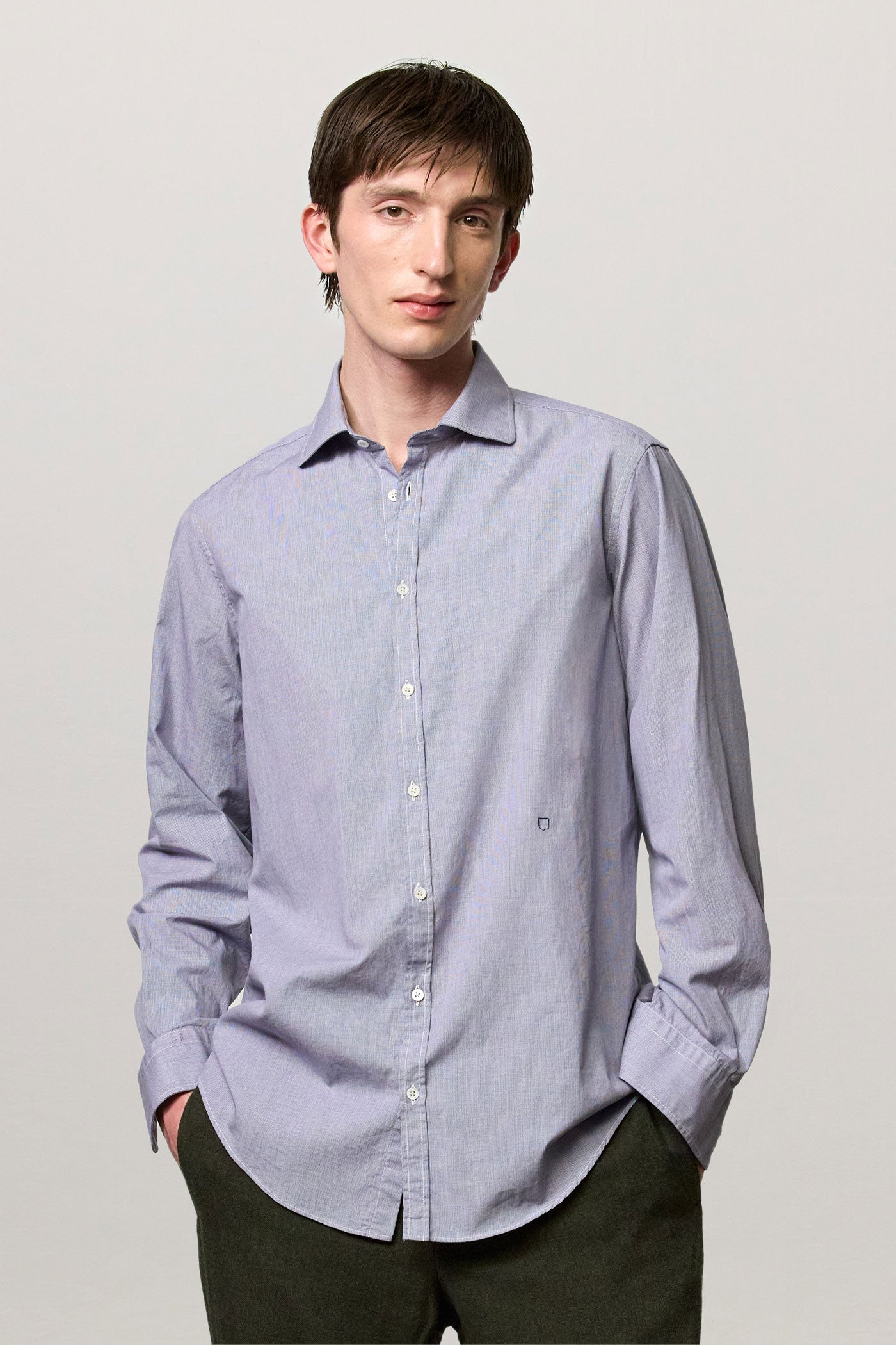Shirt with a soft rounded collar, front closure, internal cotton voile plastron detail and embroidered crest for numbering. Pointed back yoke and rounded hem. Classic fit. Crafted from yarn-dyed pure cotton jacquard. Made in Italy.