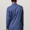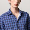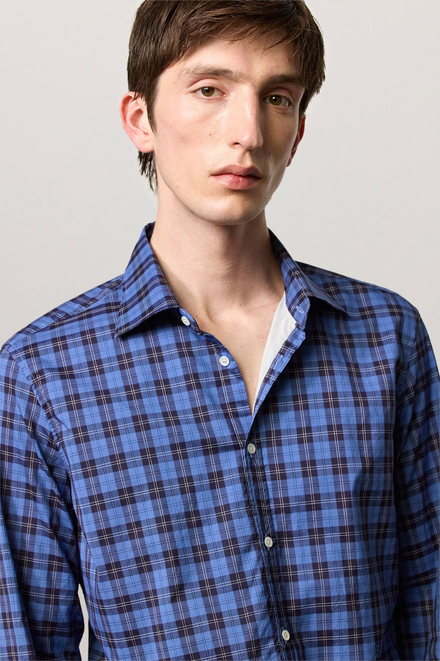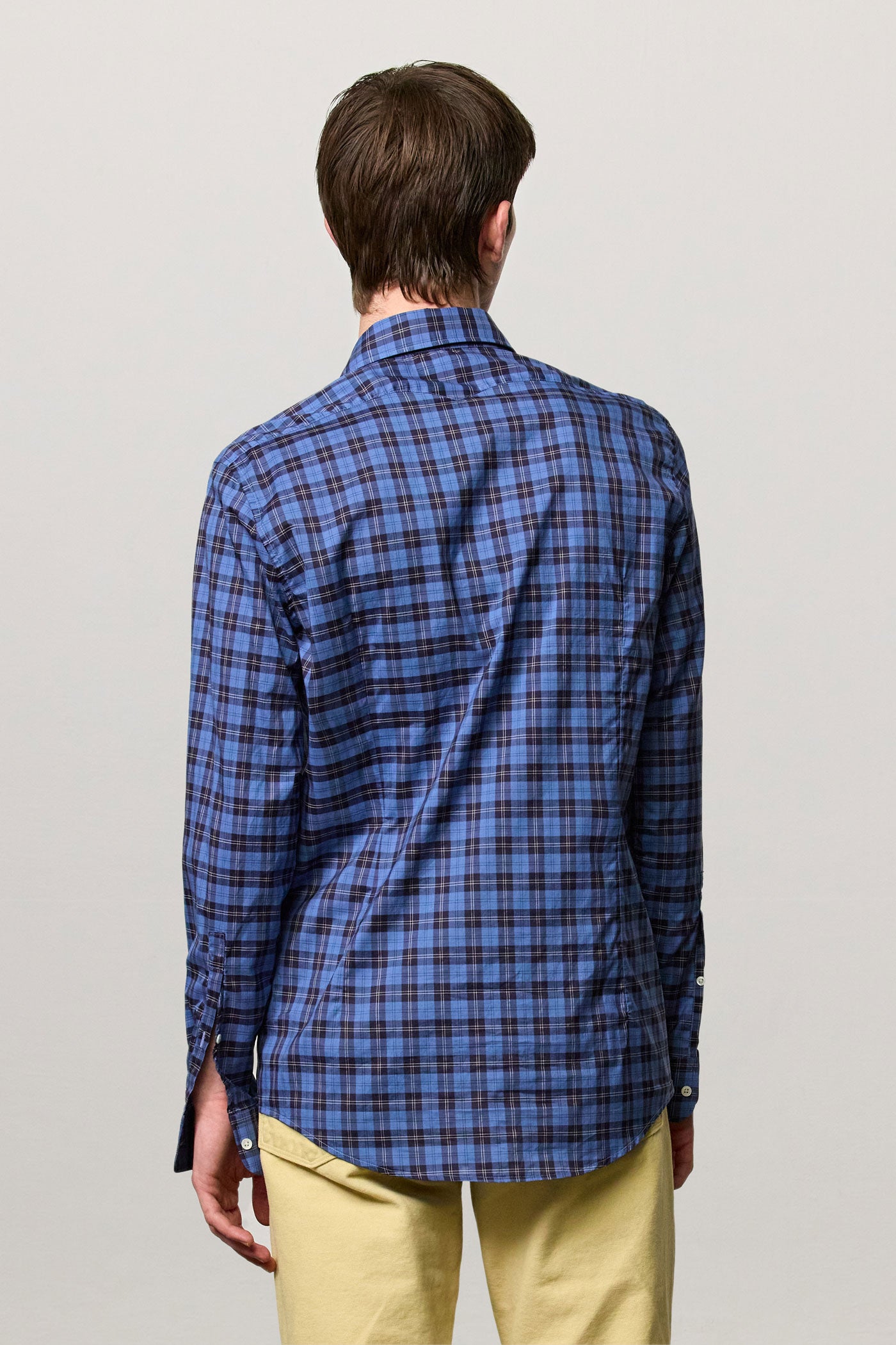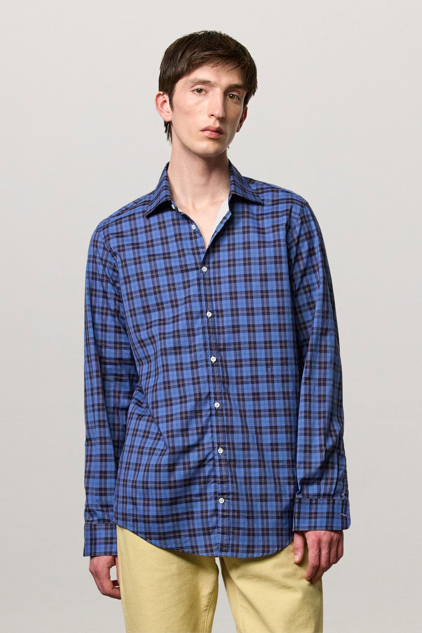 hirt with pointed collar, front closure, cotton voile plastron detail and embroidered crest for numbering. Pointed back yoke with rounded hem. Regular fit. Crafted from yarn-dyed cotton micro check. Made in Italy.