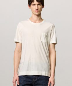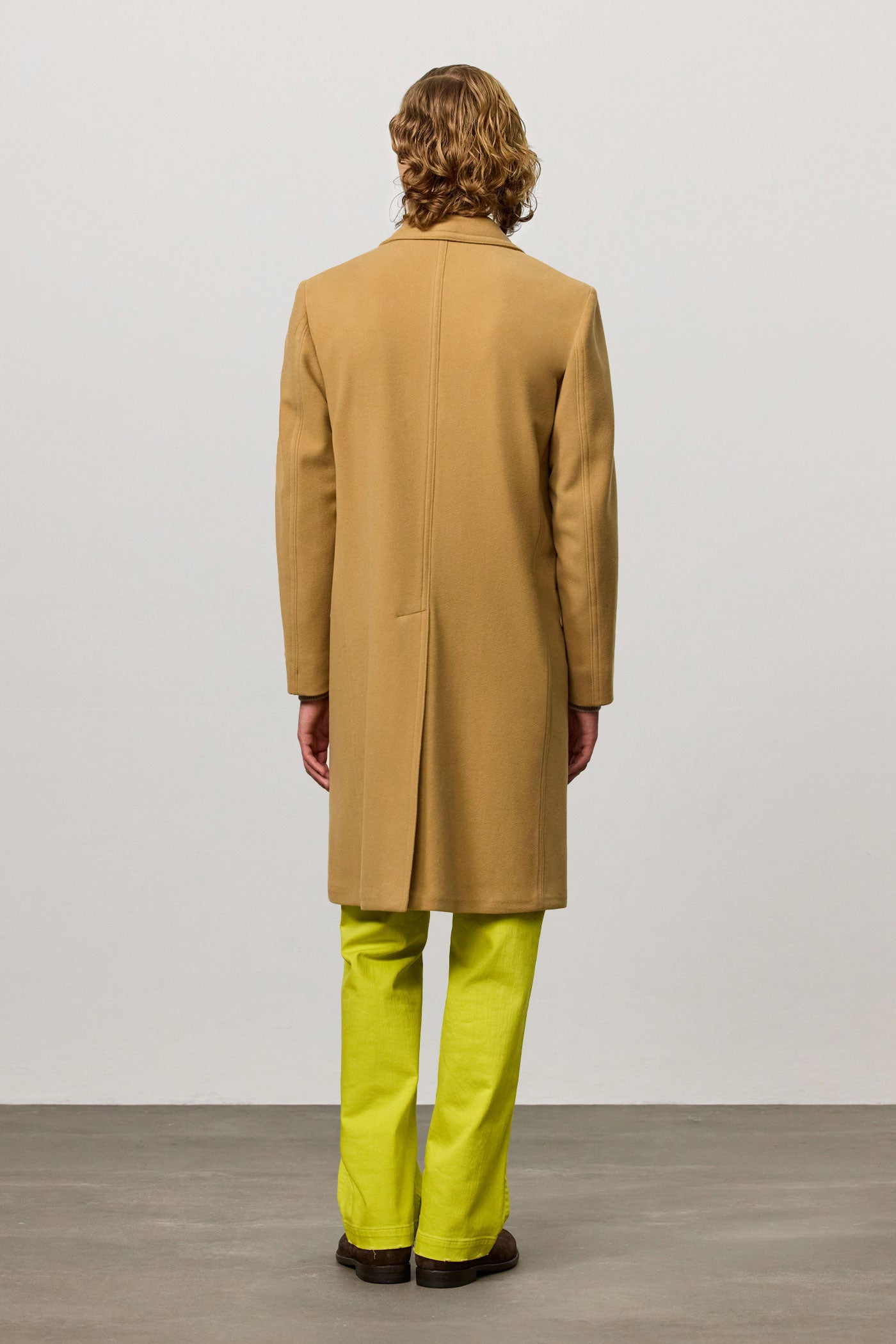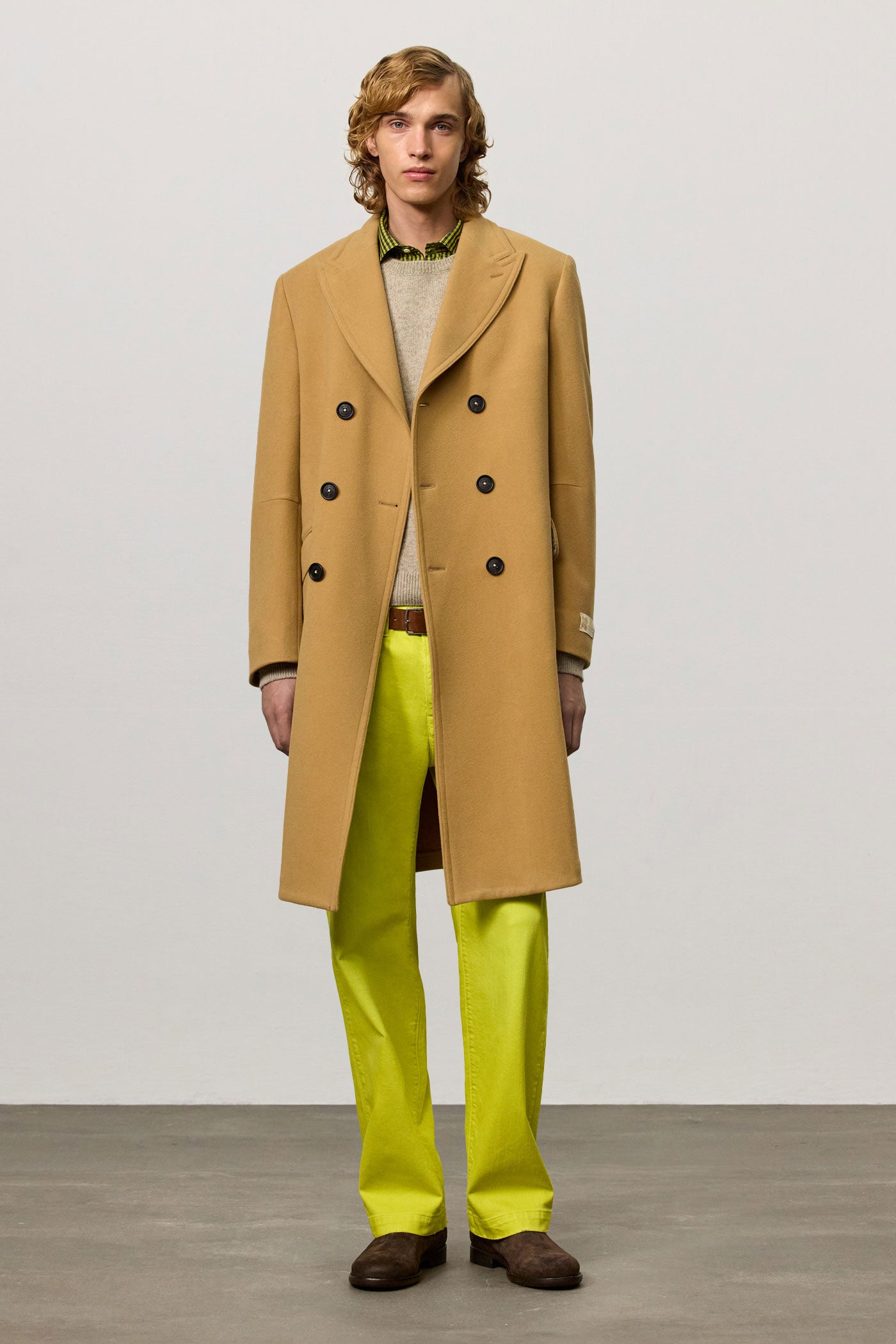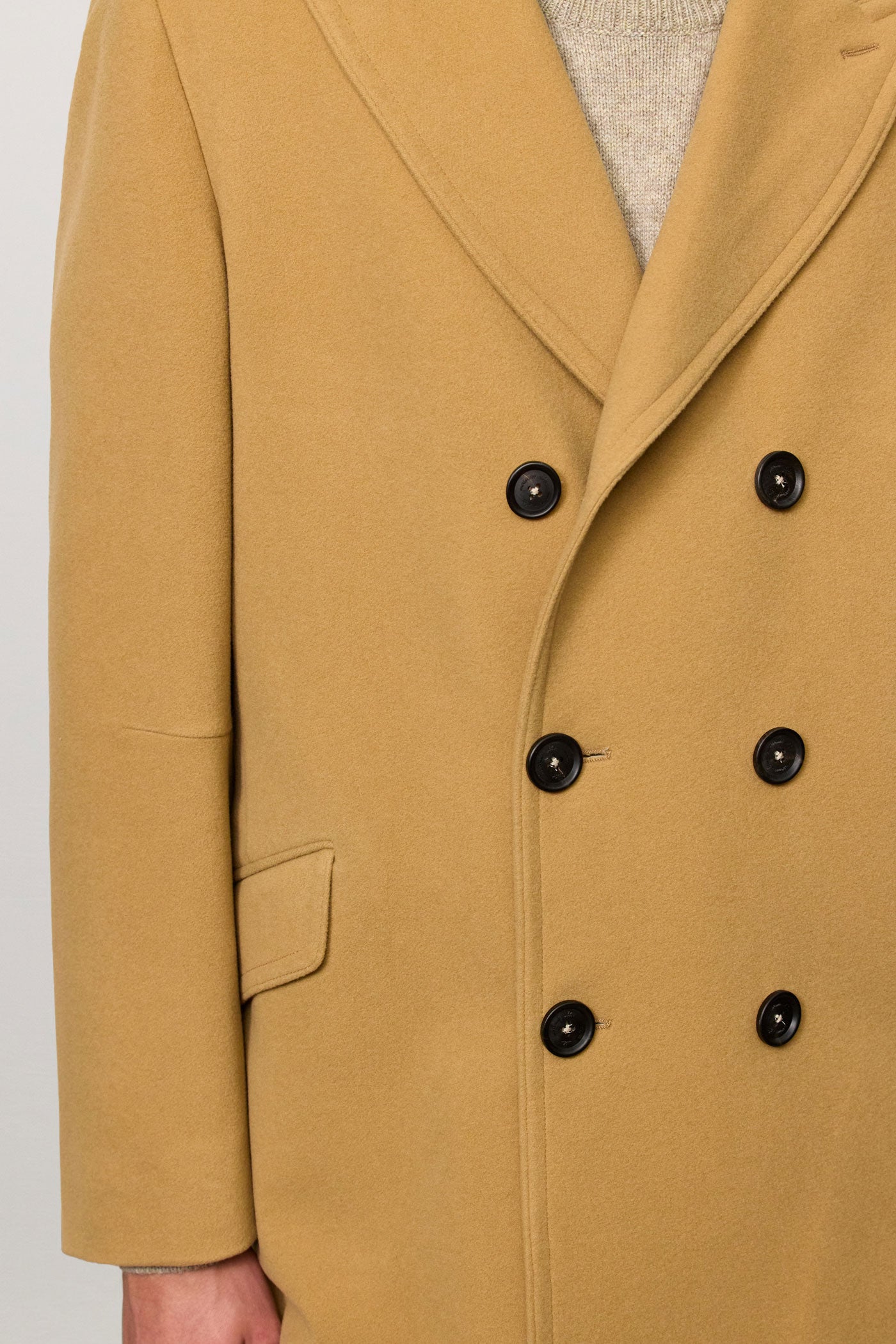 Regular fit long double-breasted coat, unlined, with six horn buttons and slanted pockets. Made from a compact virgin wool fabric. Made in Italy.