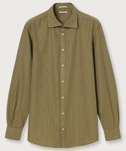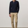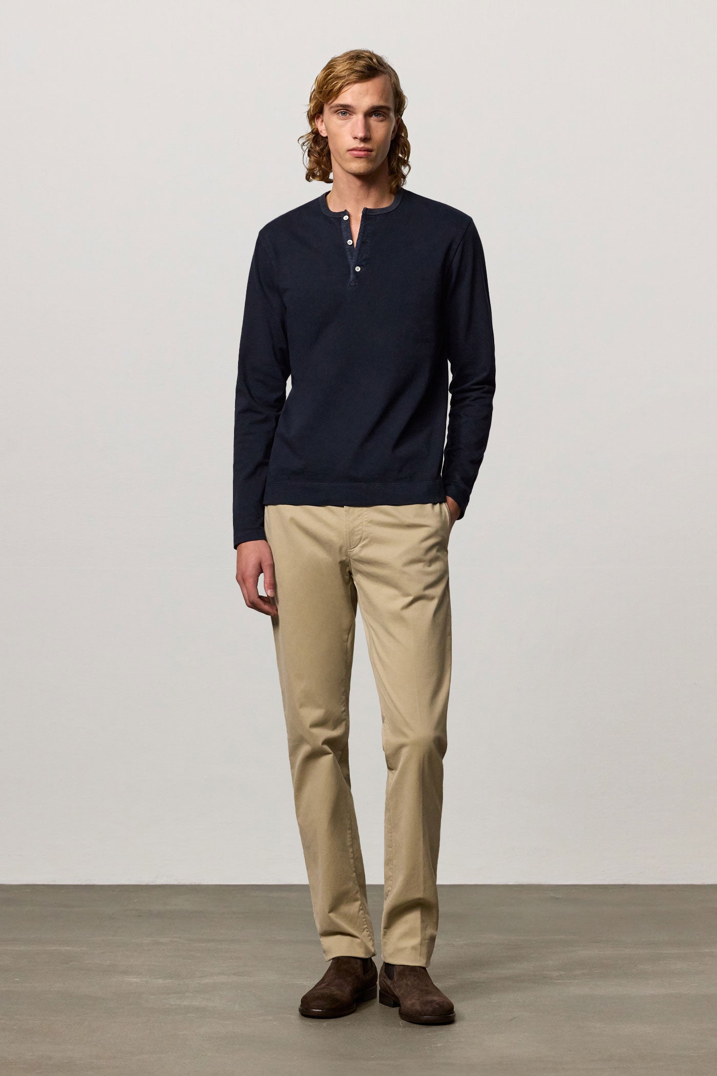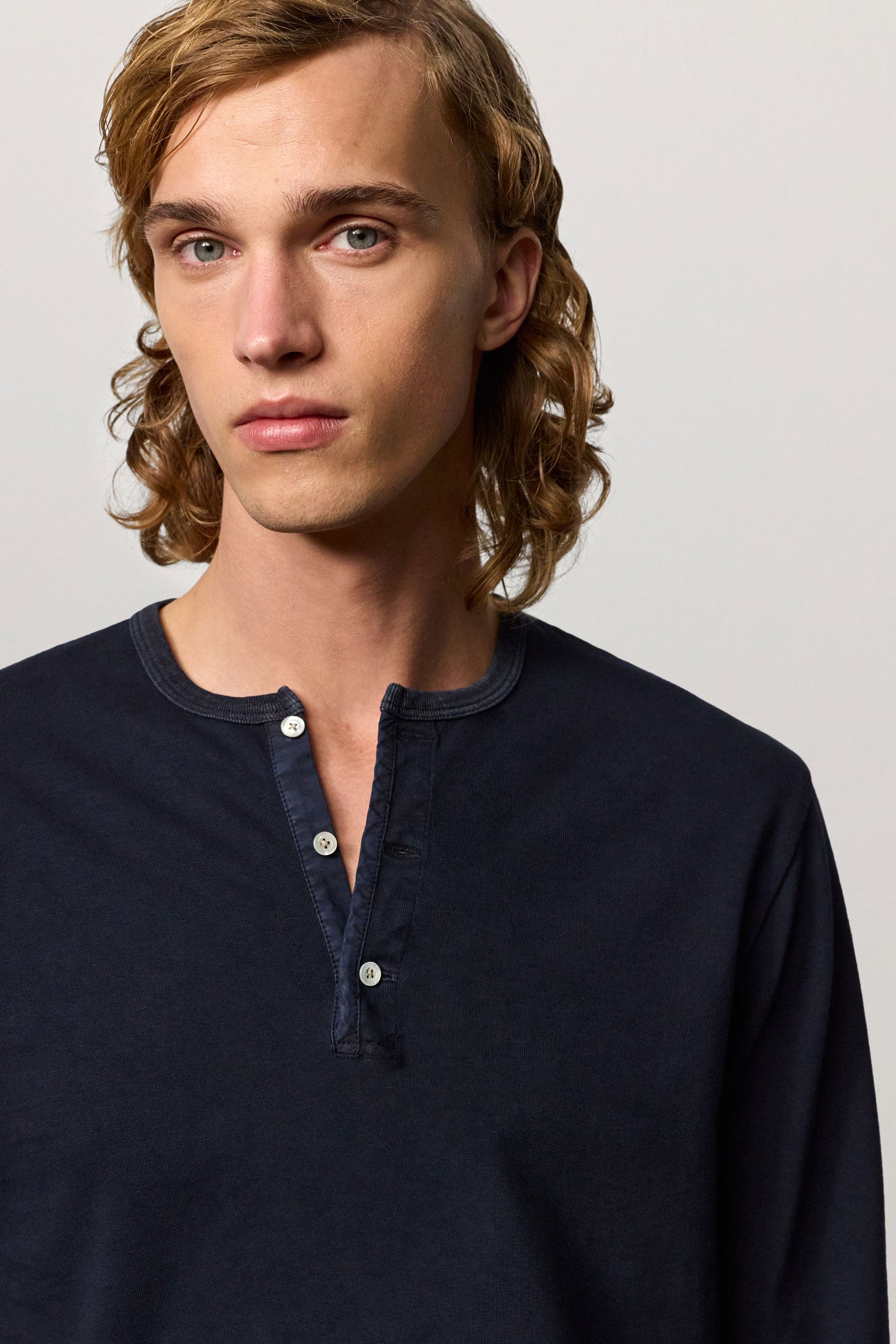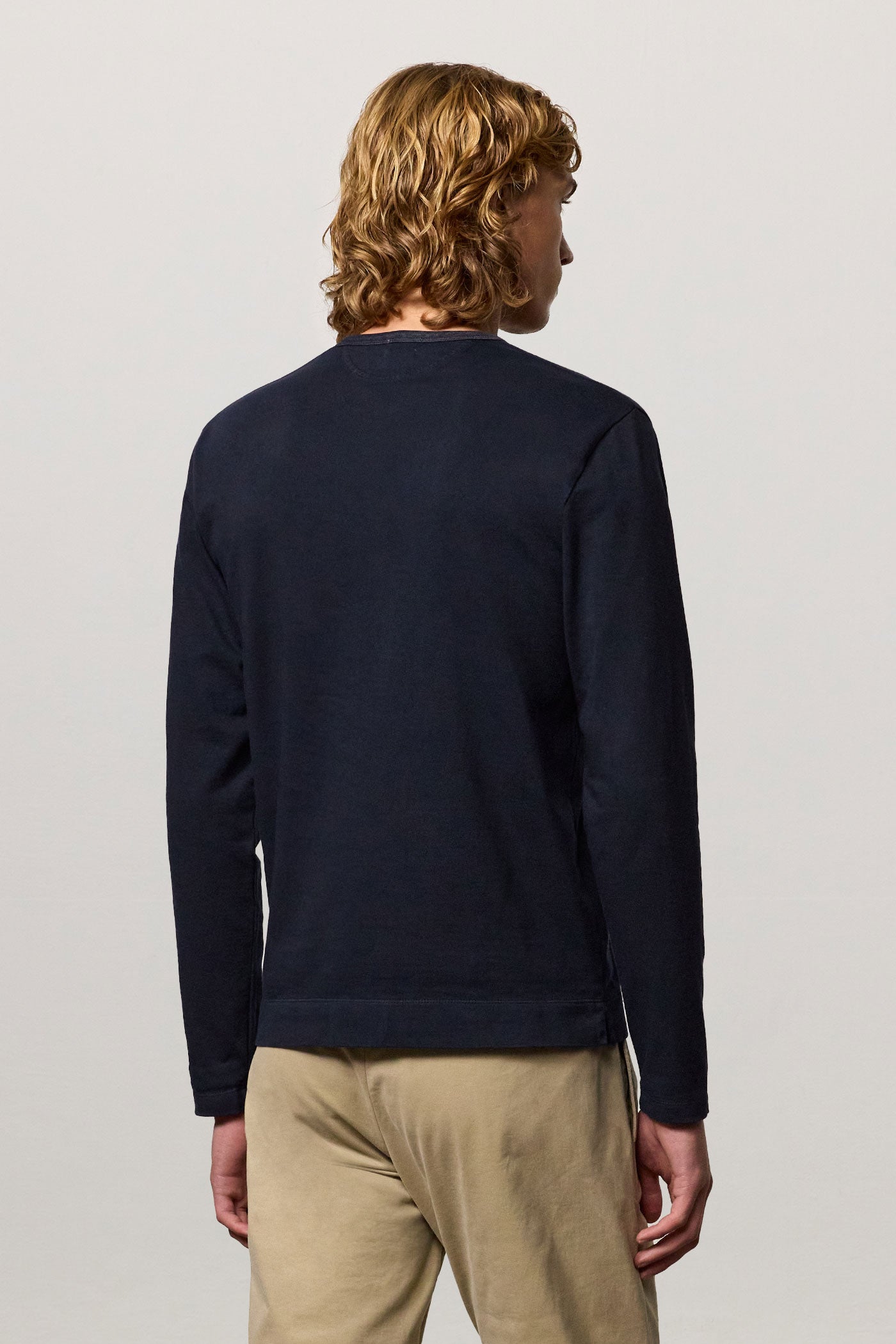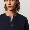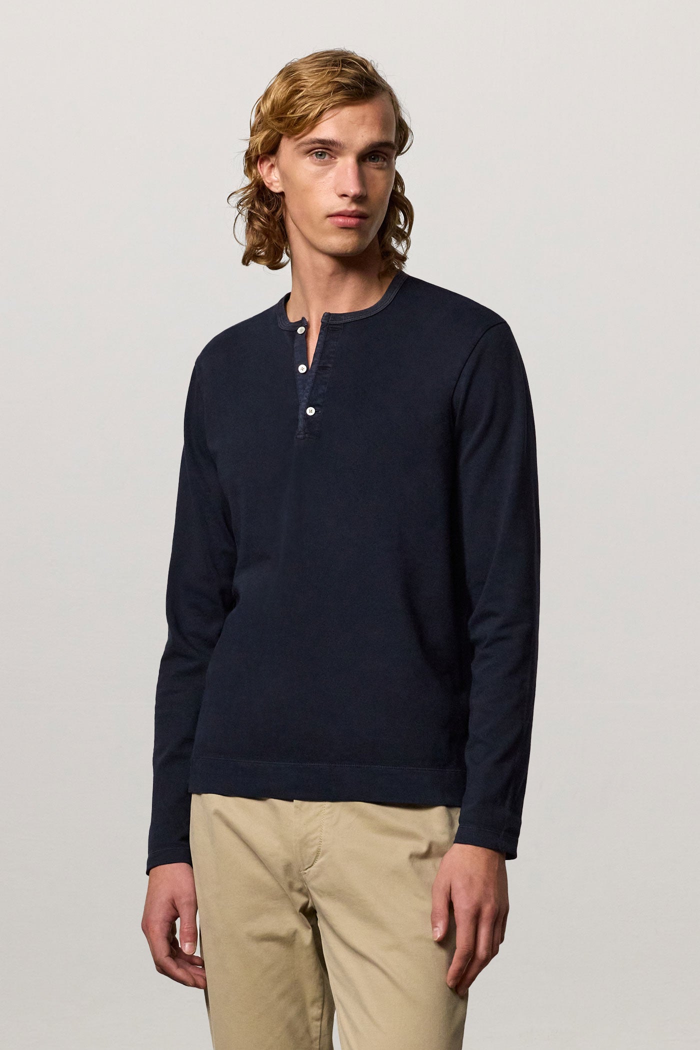 Long-sleeved t-shirt, guru collar, partial opening with three mother-of-pearl buttons, regular fit, made in lightweight organic cotton jersey. Made in Italy.