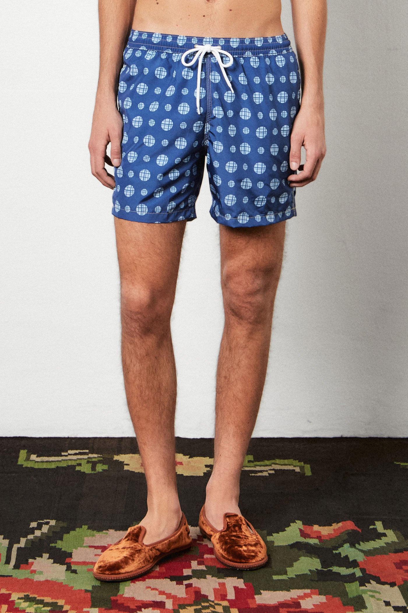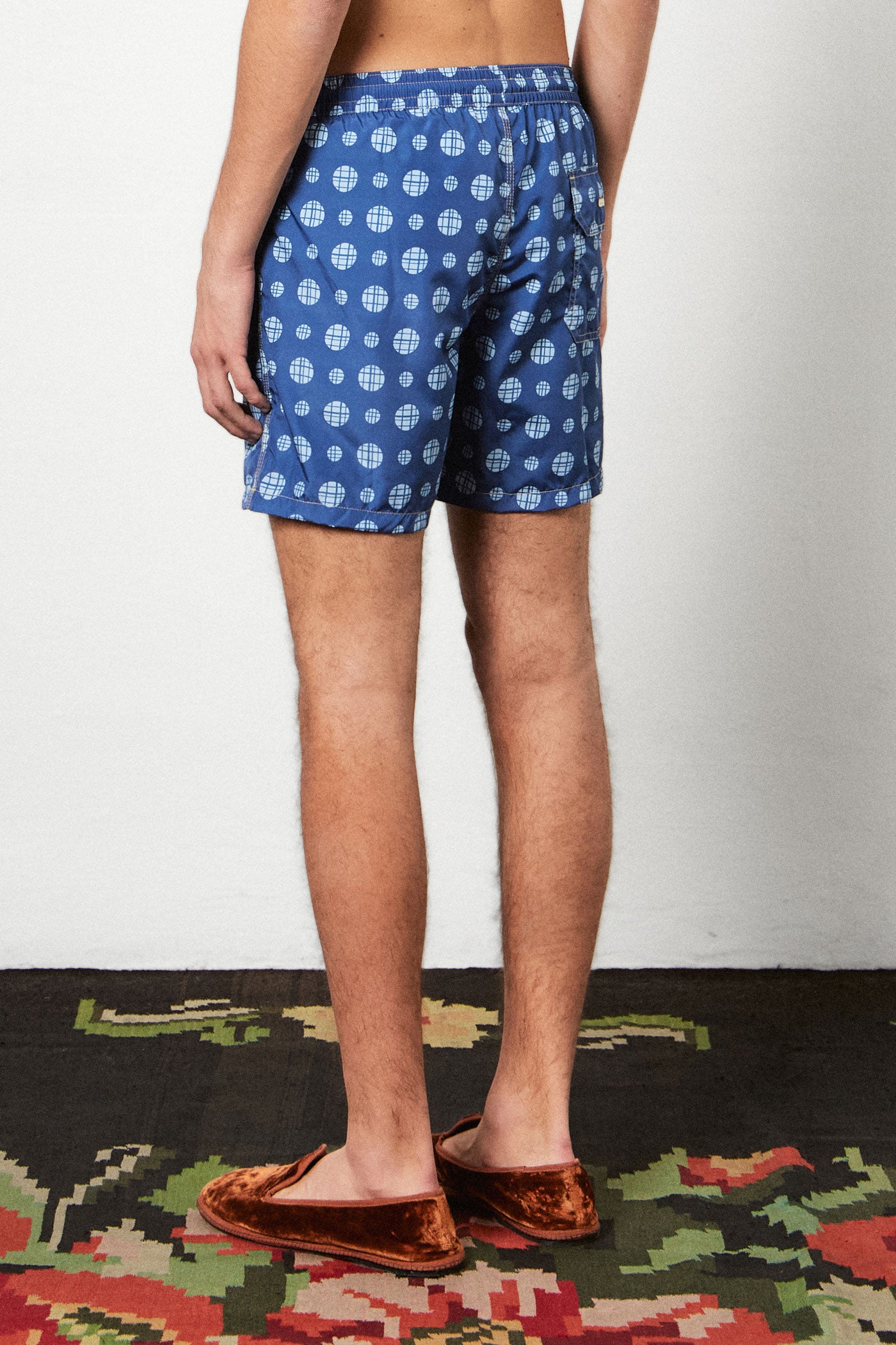 Classic fit swim shorts with a drawstring waistband, two side pockets, a back pocket featuring the Massimo Alba logo, and mesh slip lining. Made in Italy.