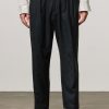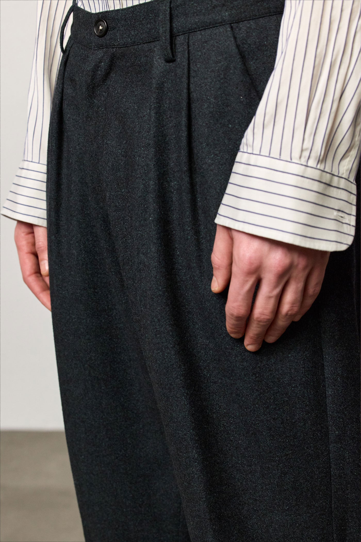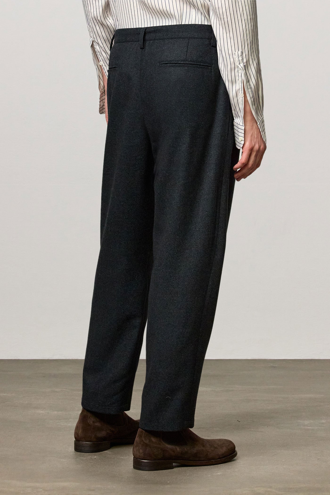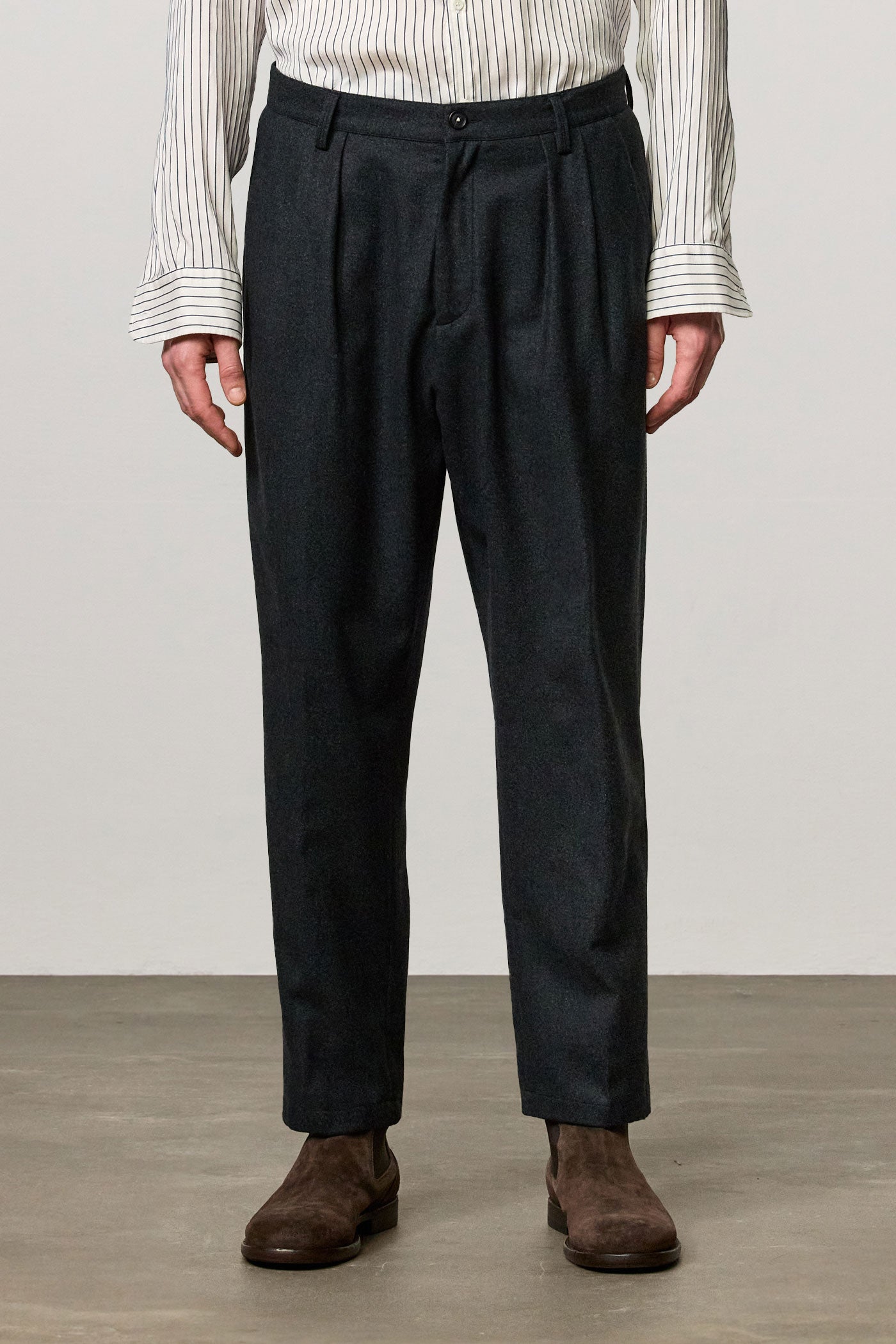 Double-pleated trousers in melange virgin wool flannel, featuring a relaxed fit. Front button and zip closure, slanted side pockets and welt back pockets. Leg opening: 20.3 cm. Made in Italy.
