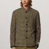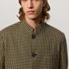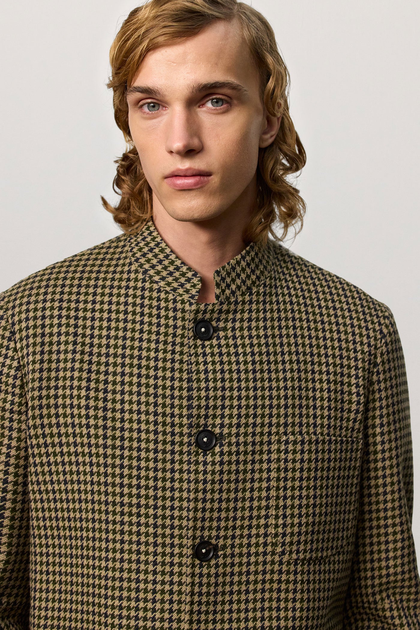 Regular-fit single-breasted jacket with a stand-up collar, patch pockets, side slits, and five horn buttons. Made in pied-de-poule fabric in virgin wool and cotton. Made in Italy.