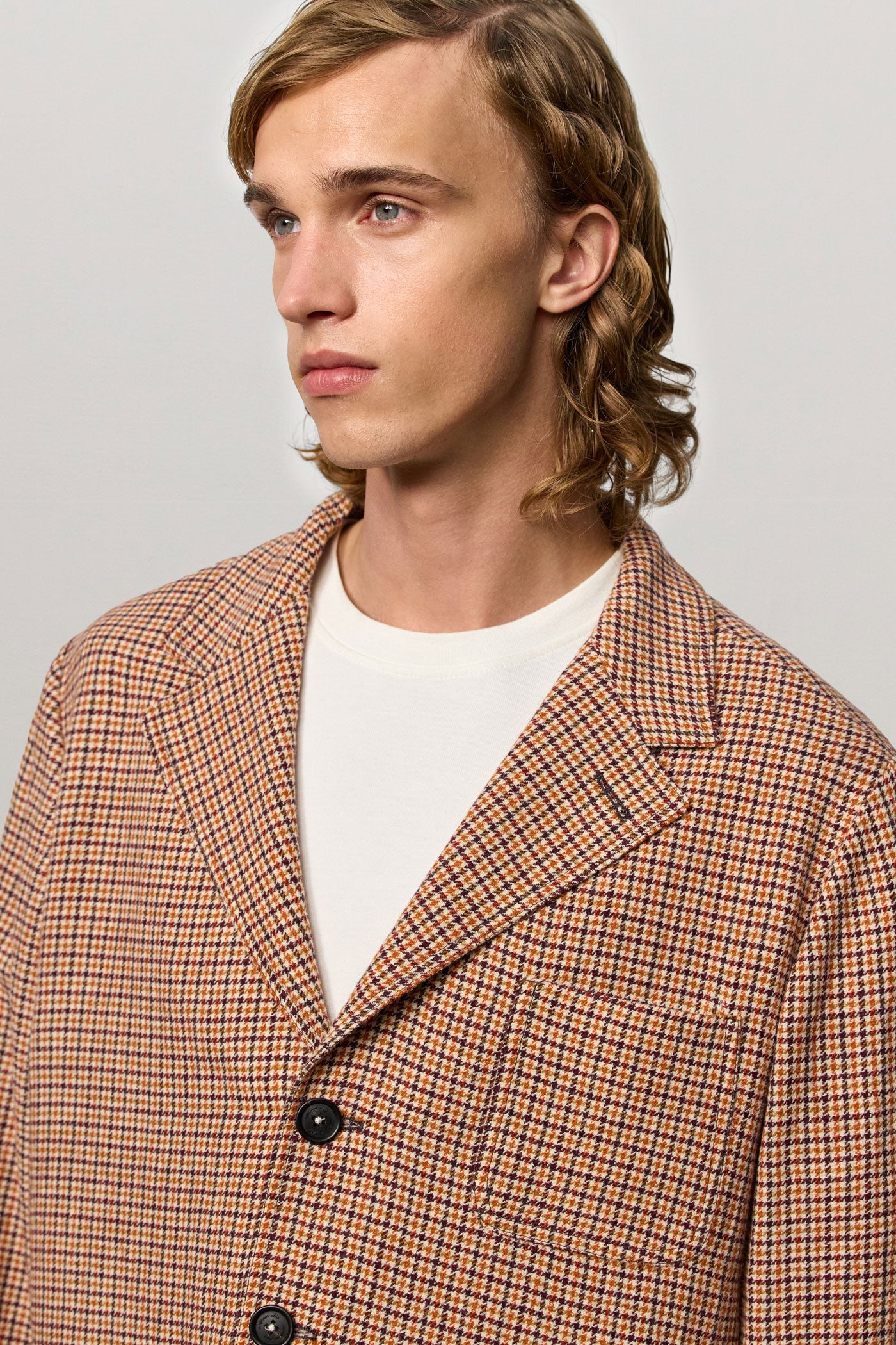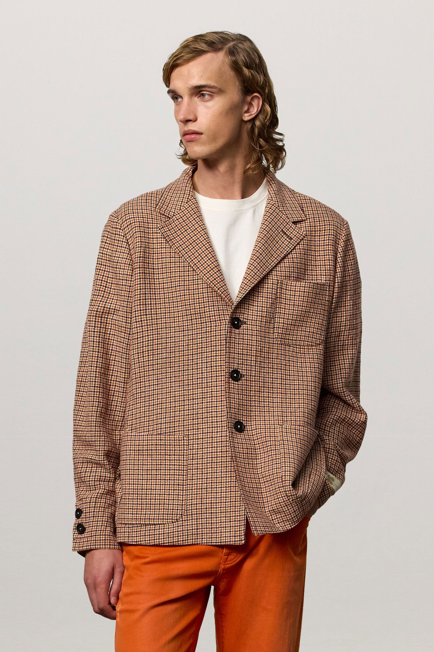 Informal jacket with four buttons, three patch pockets, and side vents, made of check-patterned seersucker in a comfort stretch wool blend. Made in Italy.
