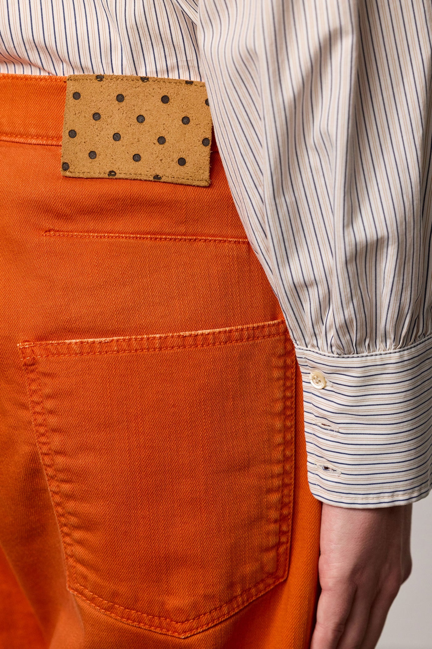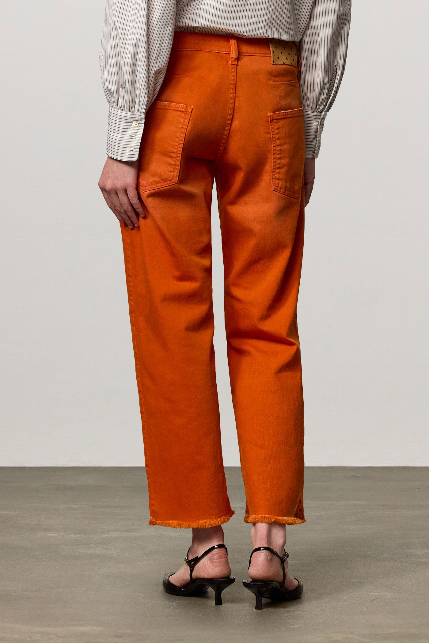 Loose-fit five-pocket boyfriend trousers, straight cut, ankle length with frayed hems. Made from slub bull-weave fabric in comfort cotton. Made in Italy.
