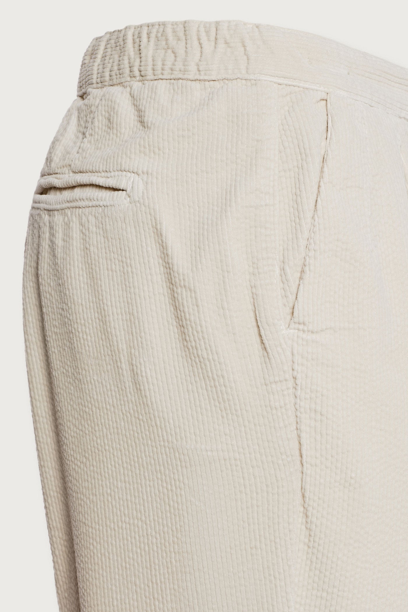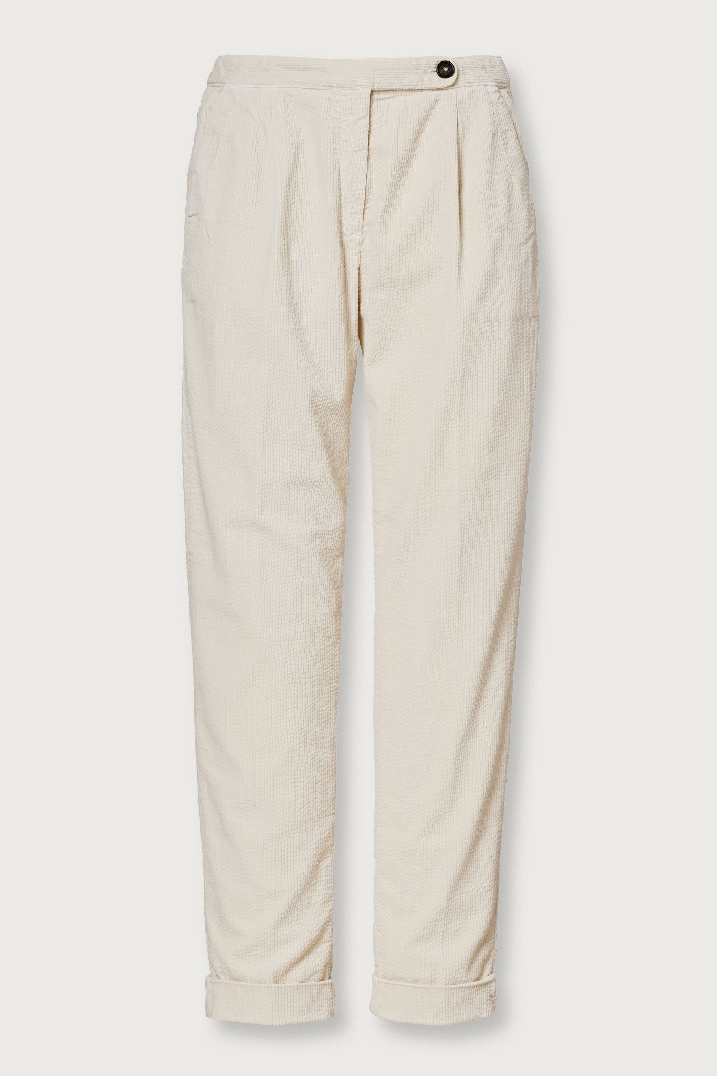 Regular fit trousers with a tab-button closure and zip, featuring an elastic waistband at the back for added comfort. Designed with a single pleat and a rolled-up hem with a 17cm opening. Crafted from cotton corduroy. Made in Italy.