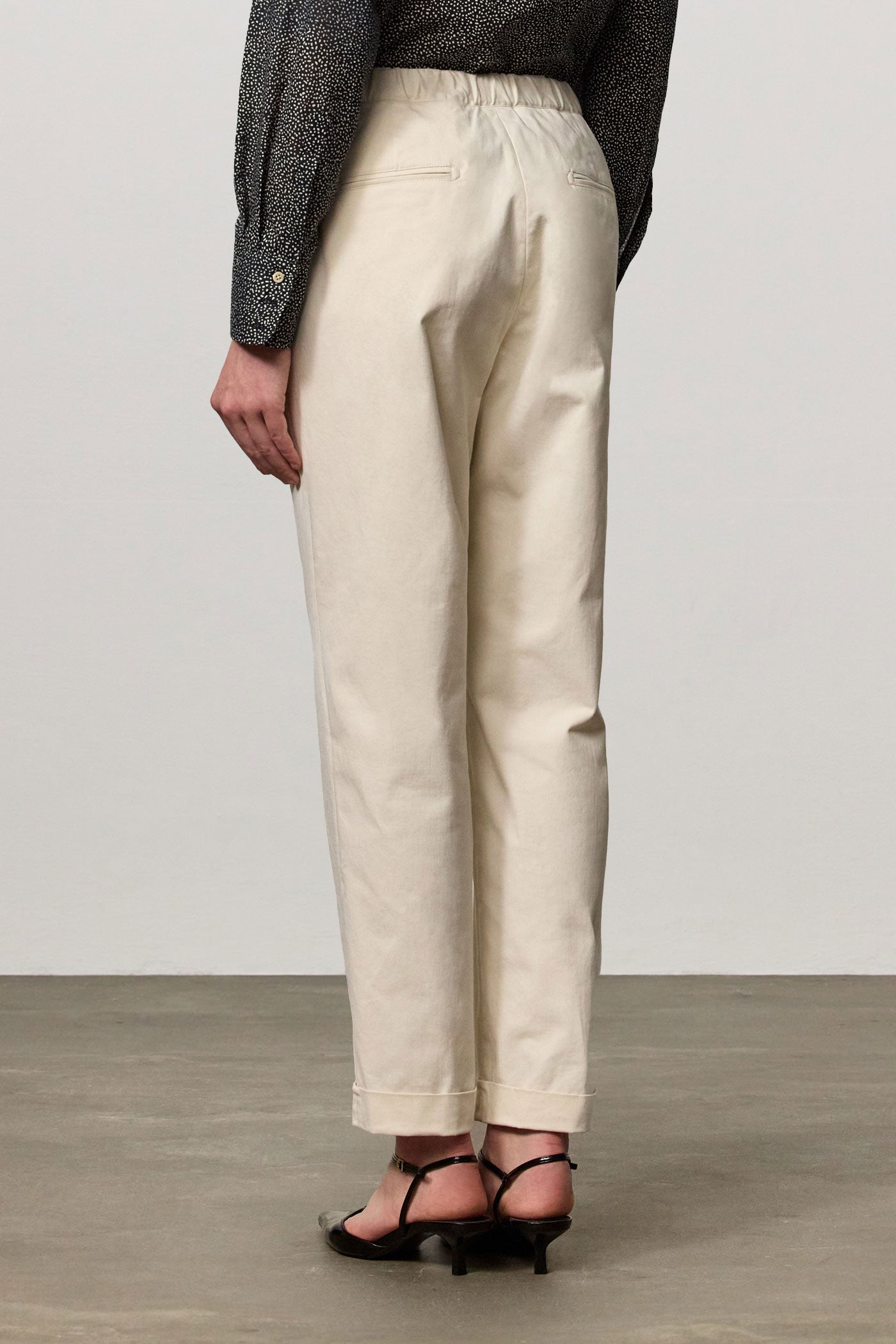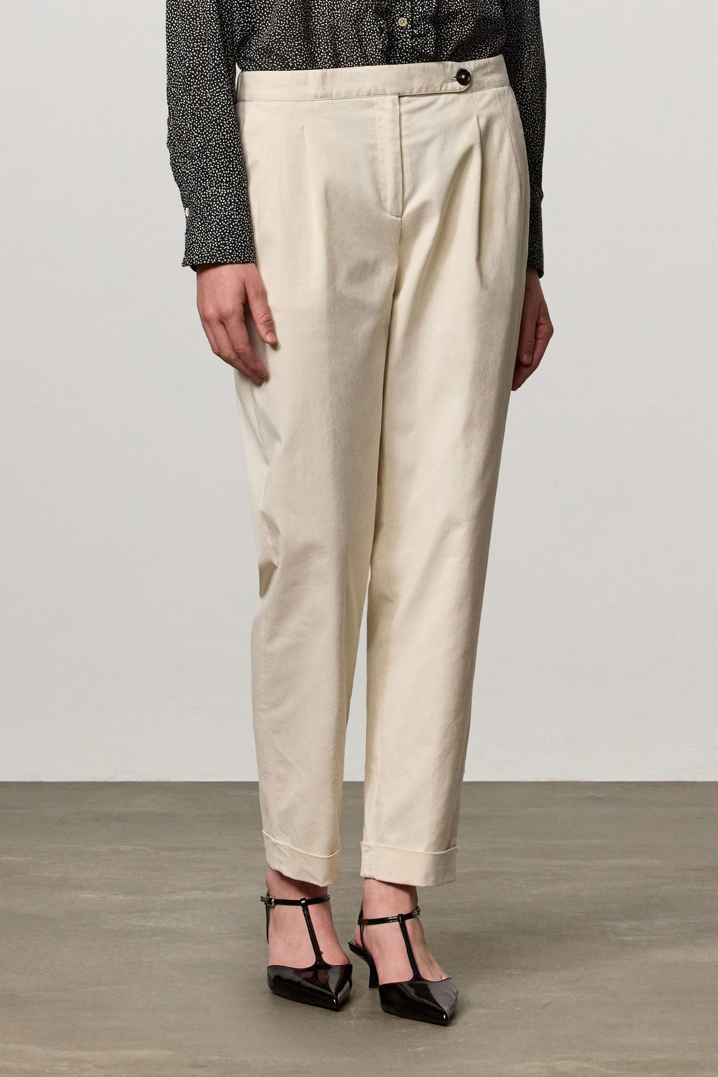 Regular fit trousers with a tab-button closure and zip, featuring an elastic waistband at the back for added comfort. Designed with a single pleat and a rolled-up hem with a 17cm opening. Crafted from a comfort cotton gabardine with a peach-touch feel. Made in Italy.