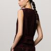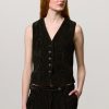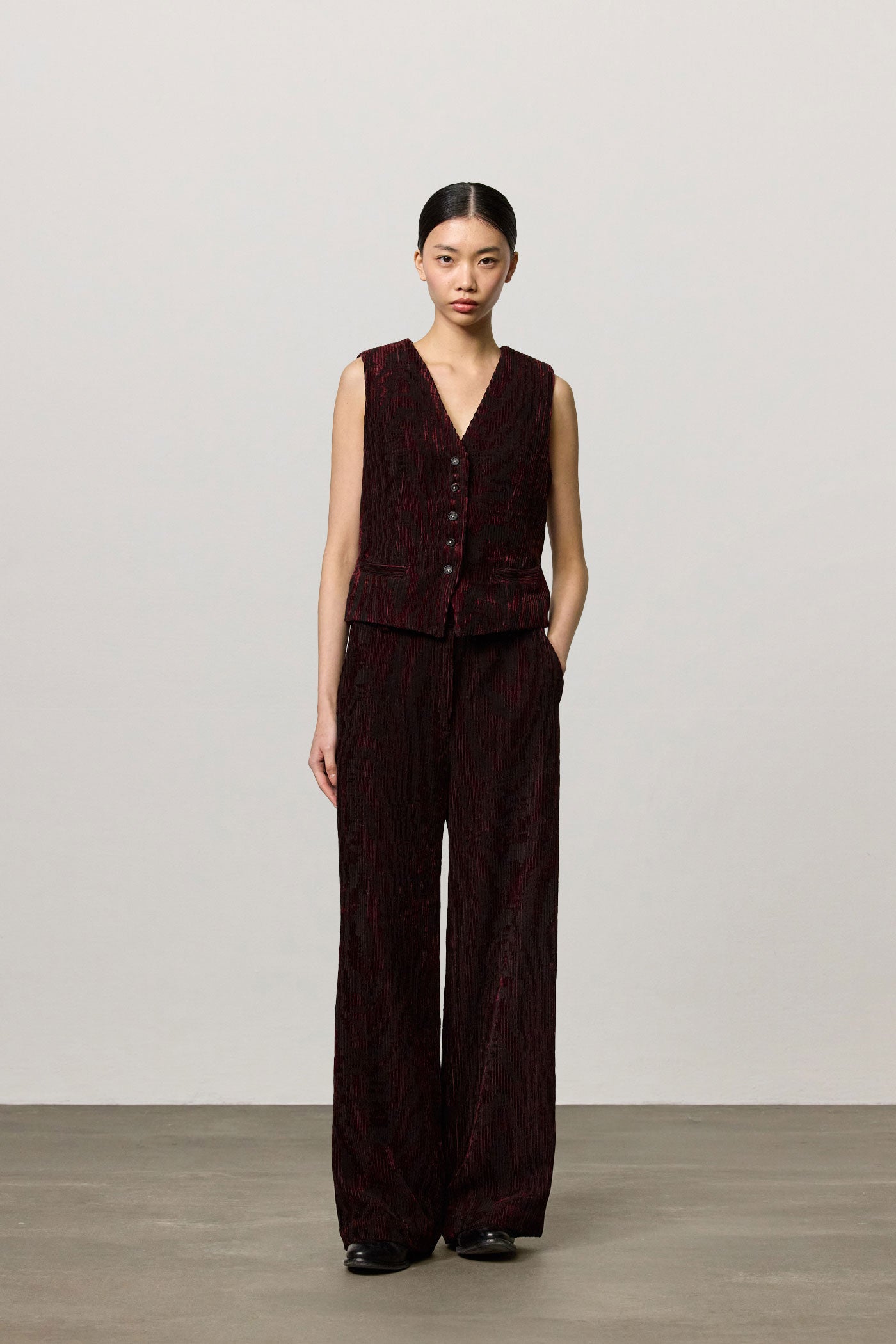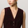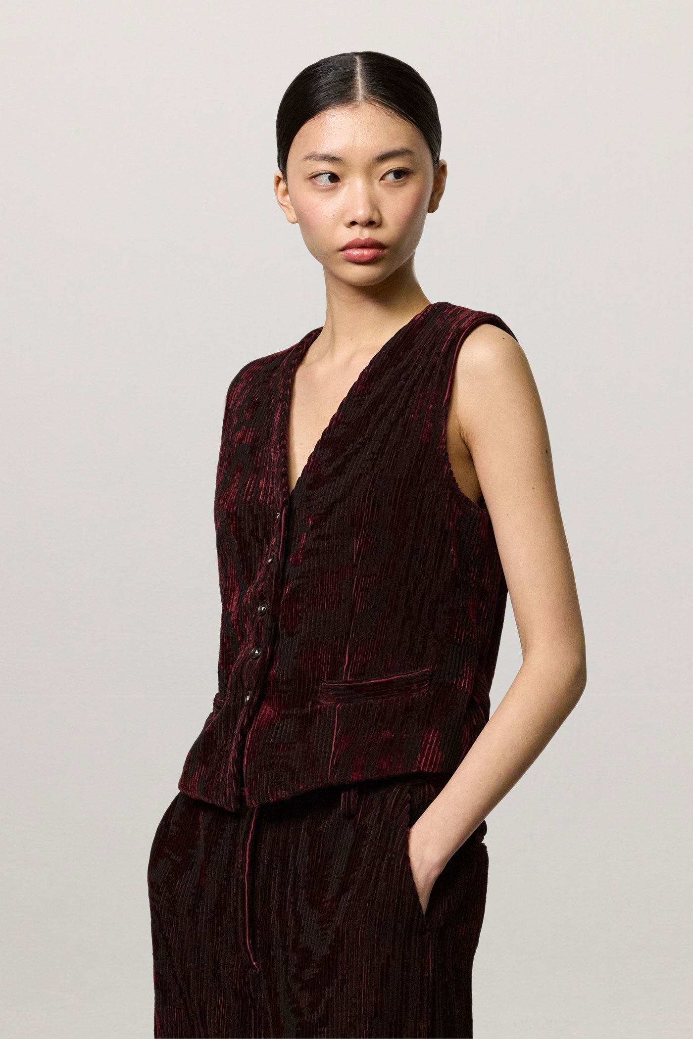 Vest with V-neckline, welt pockets, horn button closure, full lining and adjustable back strap with two buttons. Crafted from bi-colour cotton corduroy jacquard velvet. Made in Italy.