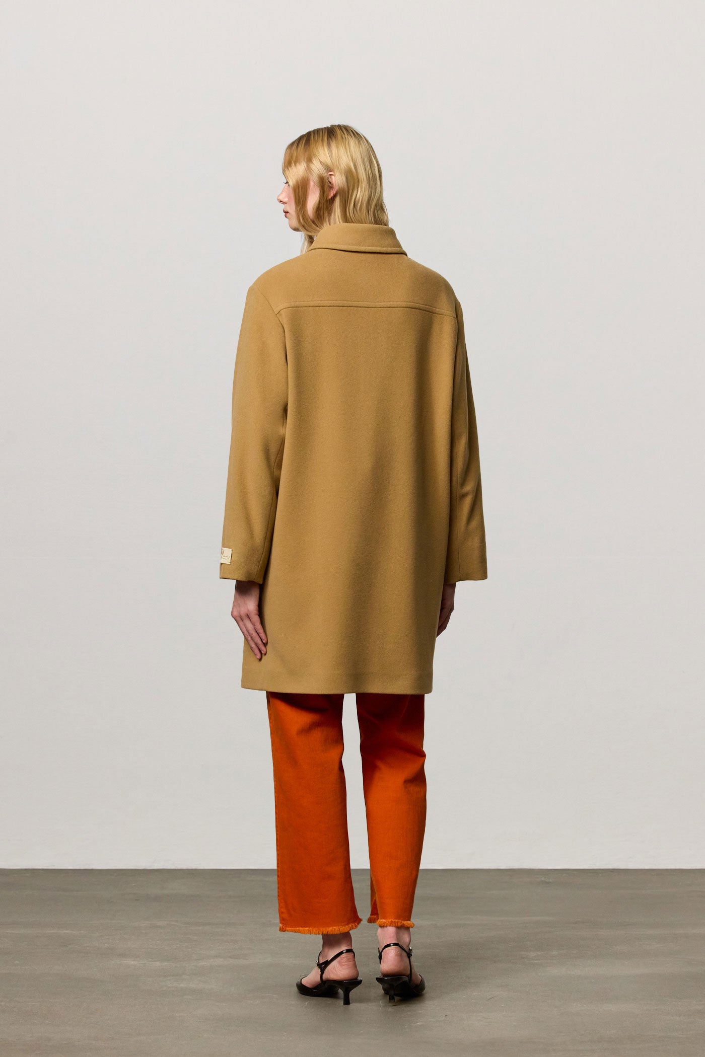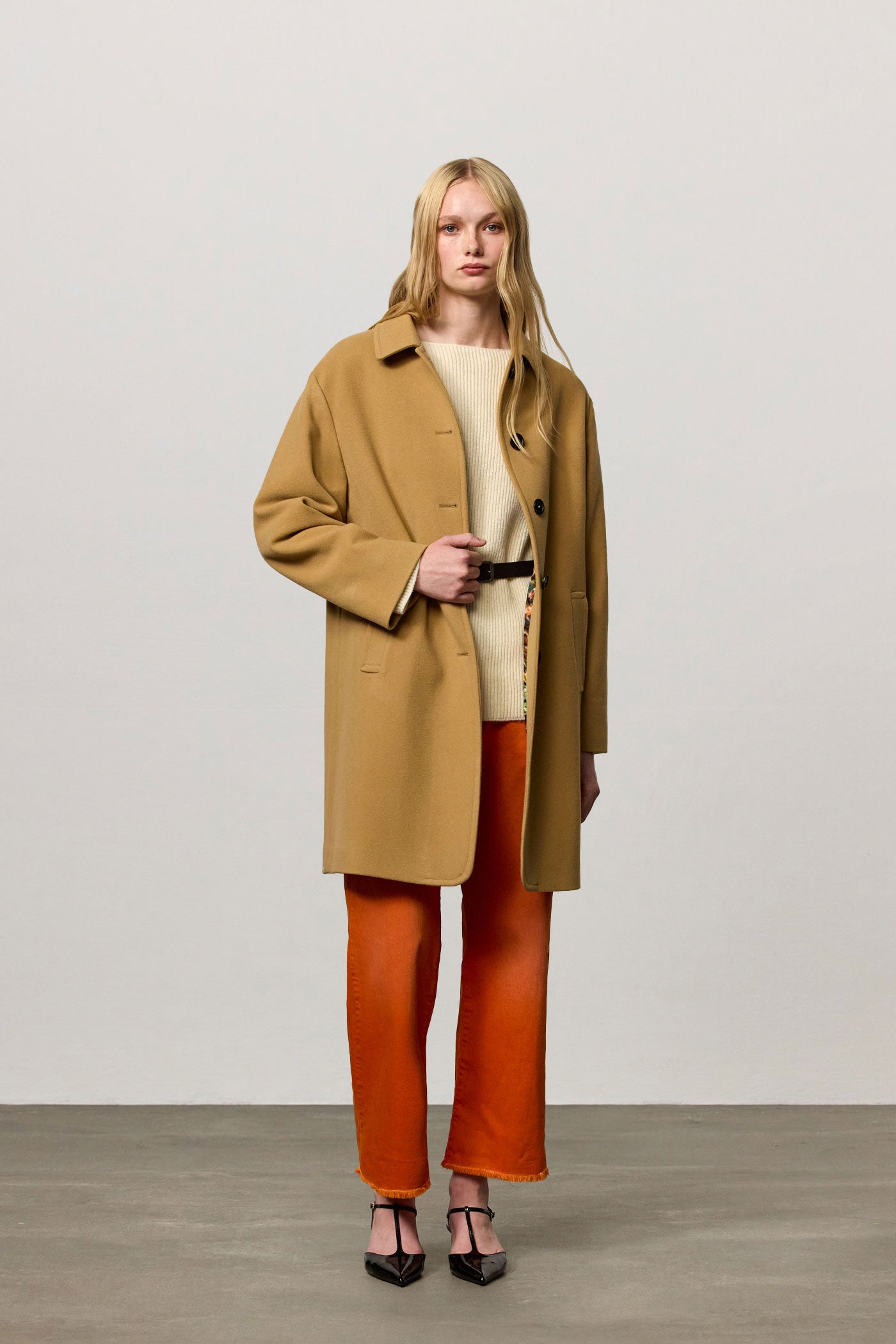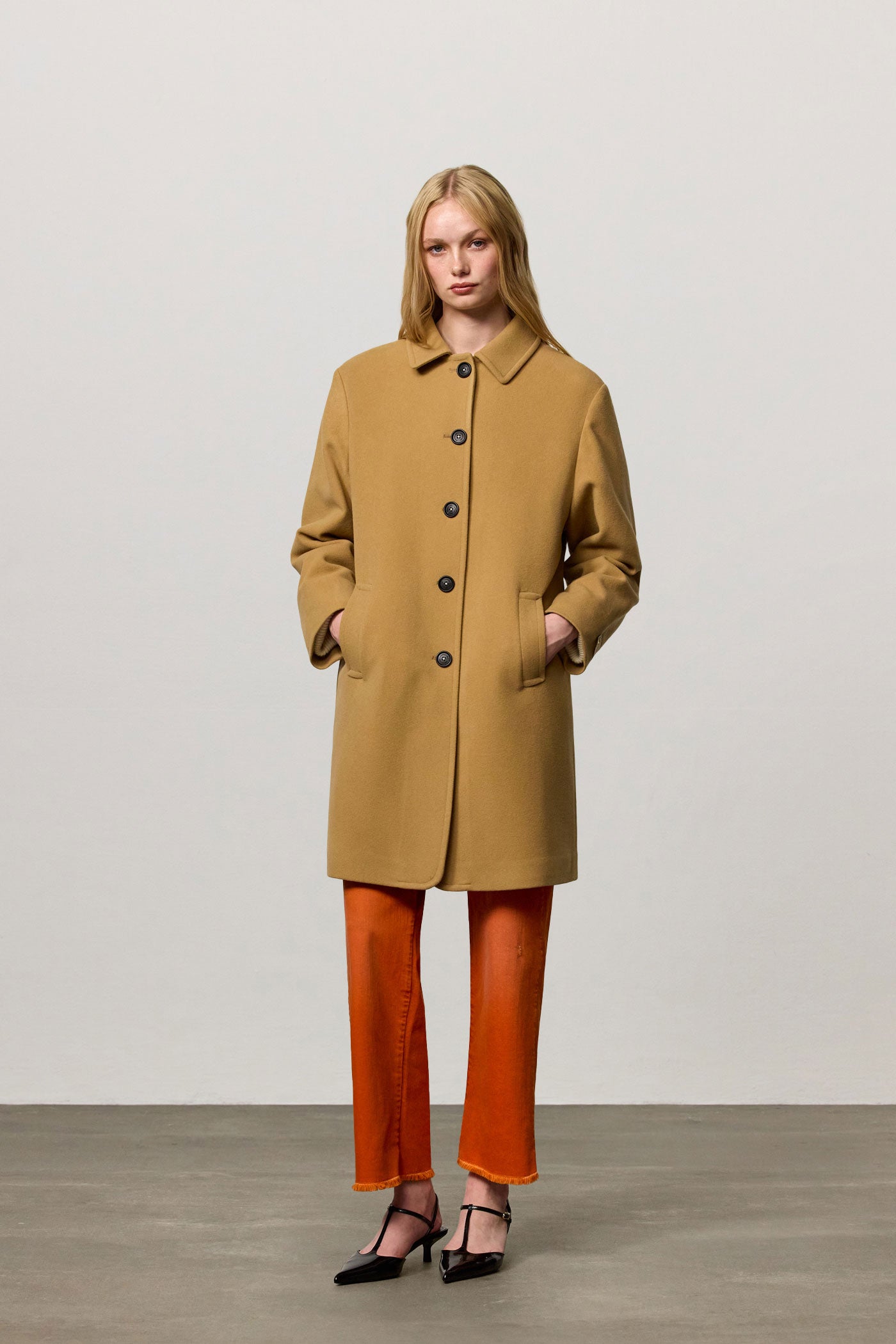 Single-breasted coat with five horn buttons, shirt collar, and slanted welt pockets. Crafted from a compact virgin wool fabric. Made in Italy.