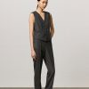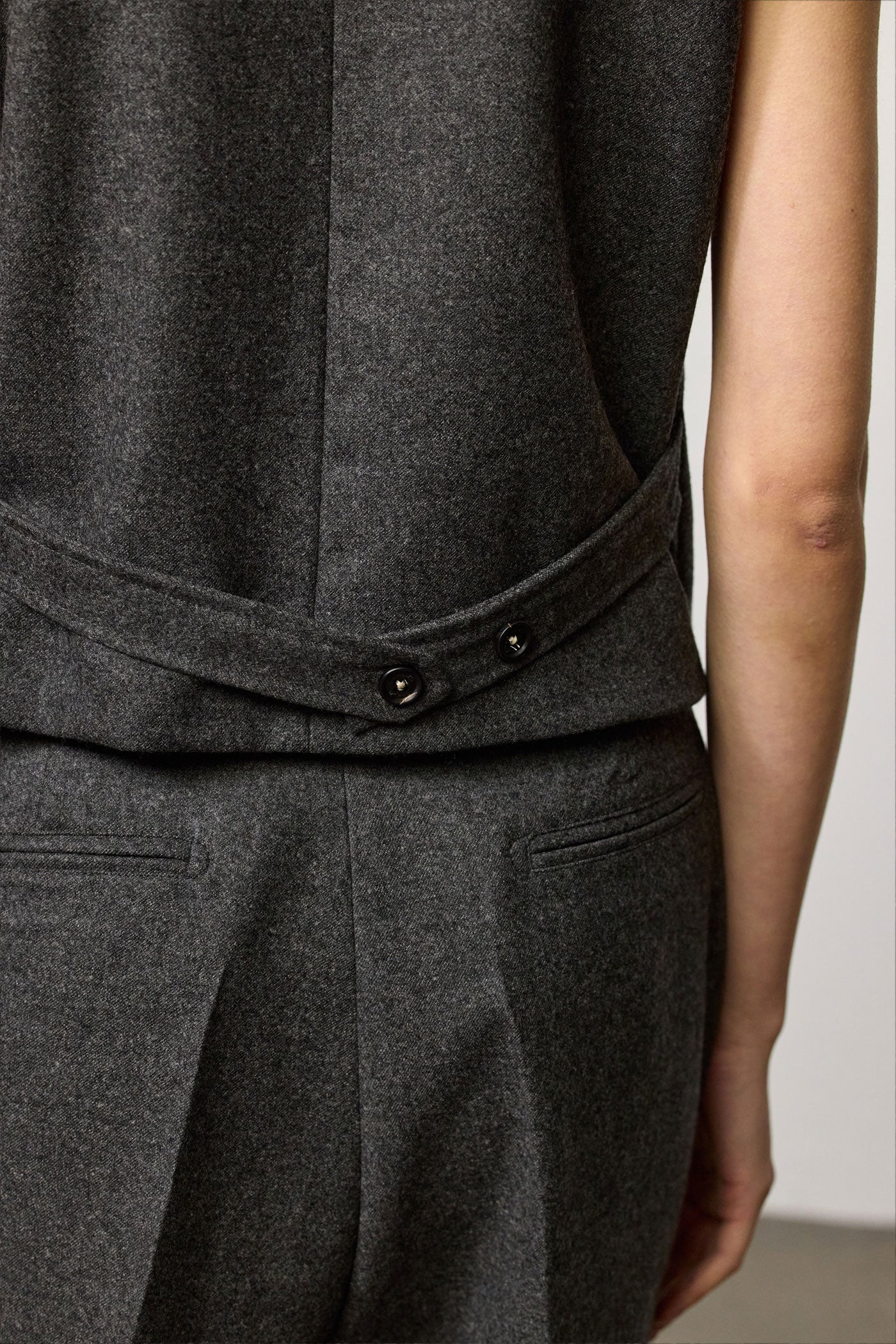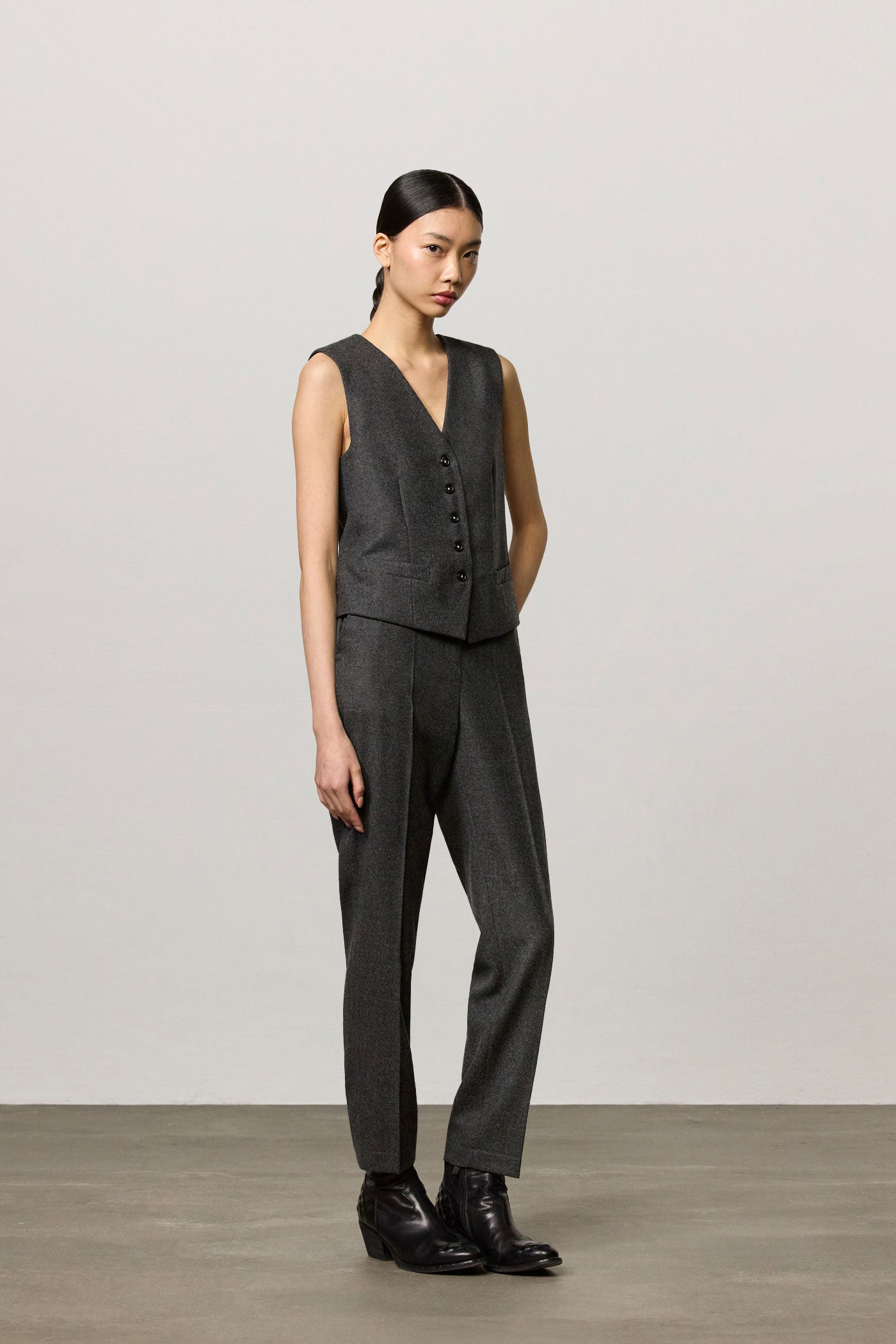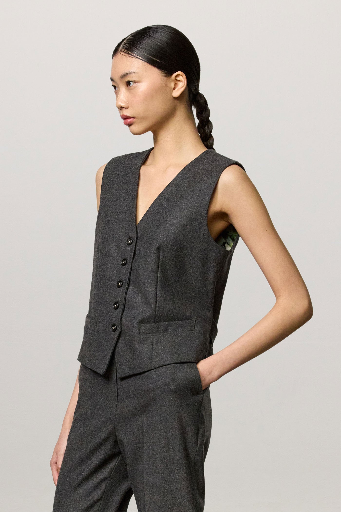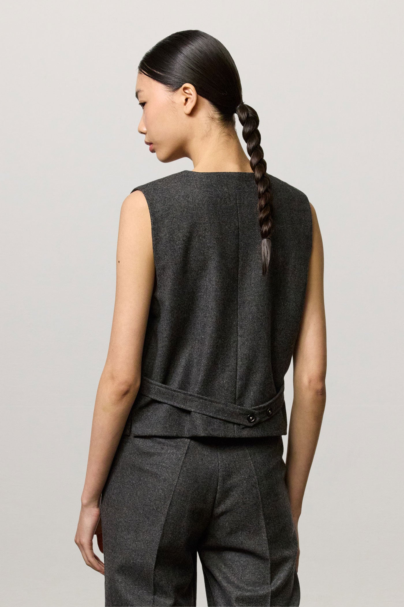 Vest with V-neckline, welt pockets, horn button closure, full lining and adjustable back strap with two buttons. Crafted from melange virgin wool flannel. Made in Italy.