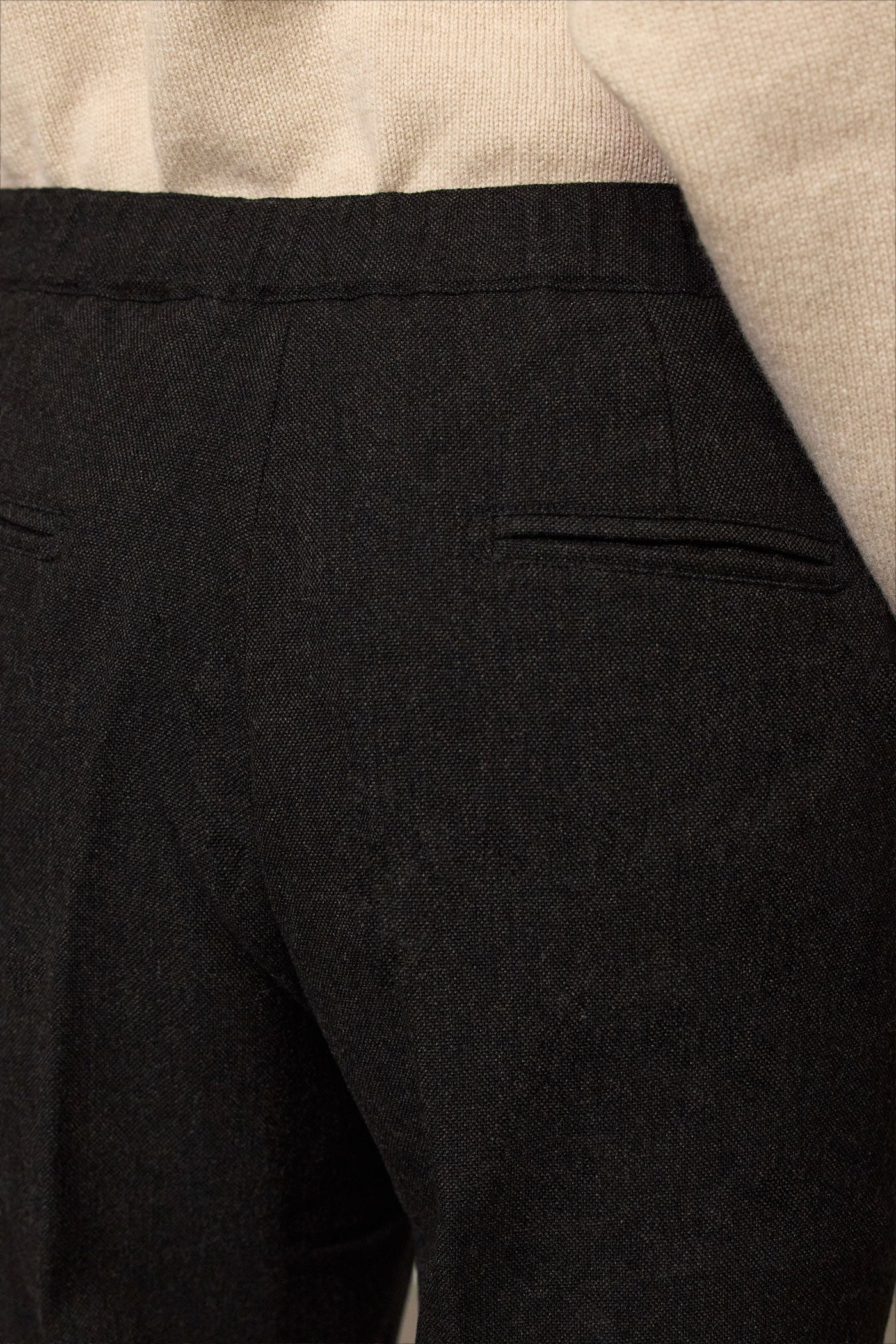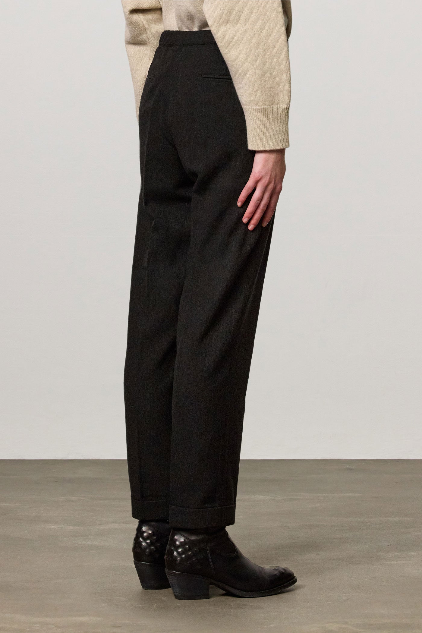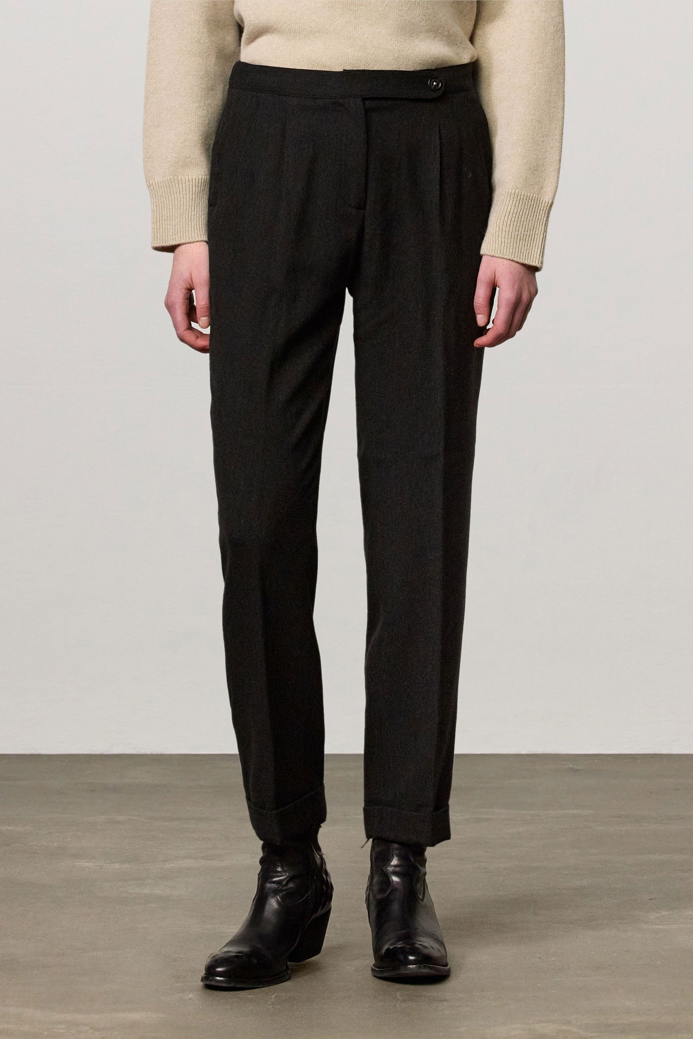Mid-rise comfort-fit trousers with double pleats, carrot leg tapered at the ankle and cuffed hem. Zip closure with horn button on side waistband. Crafted from soft wool. Made in Italy.